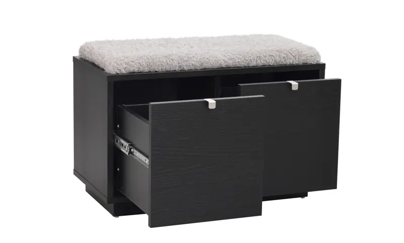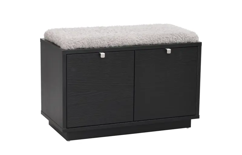 Confetti sittbänk i fanerad svartpigmenterad ek med dyna i fårskinnsimitation. Praktisk och stilren sittbänk med två rymliga lådor som tar hand om förvaringen. Ingår i hallserien Confetti.