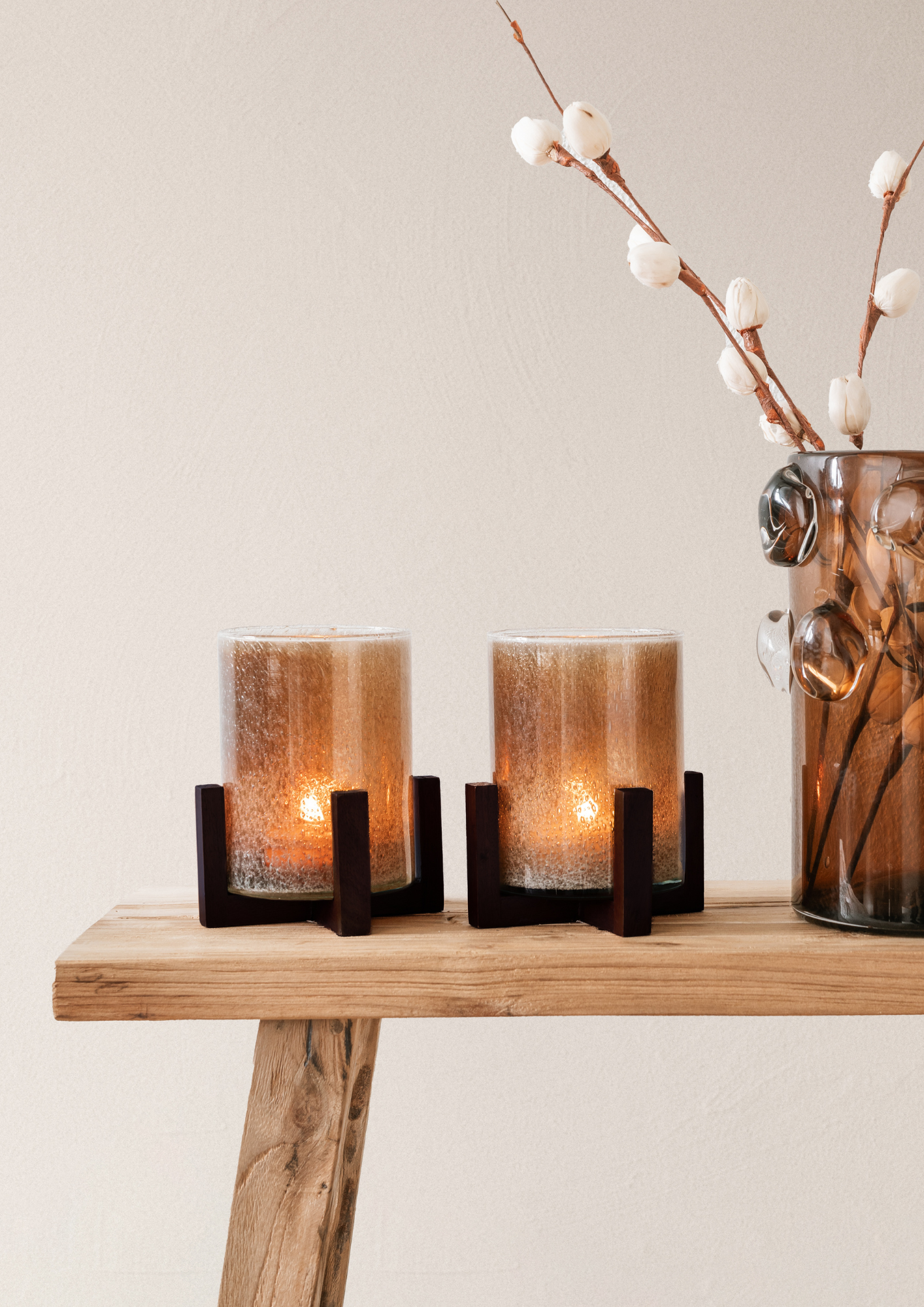 Ljuslykta i brunt glas med dekorativ bubbeleffekt, brun träställning.