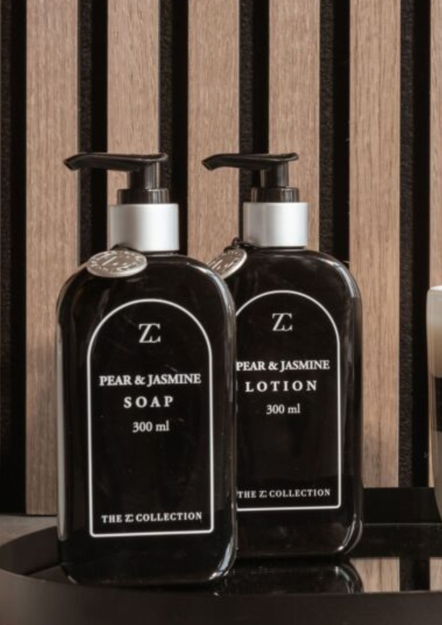 Krämig lotion i behållare av återvunnet plast. Fin amulett runt halsen. Ljuvlig doft av sommarpäron och jasmine.