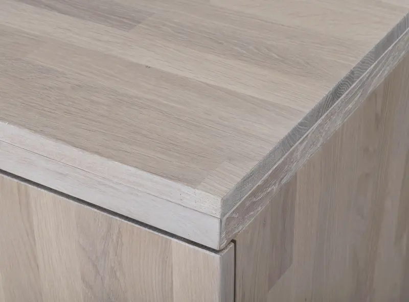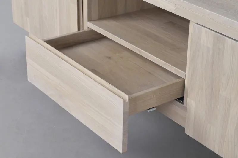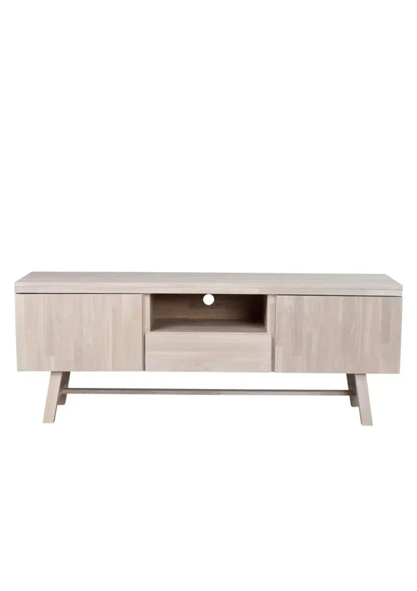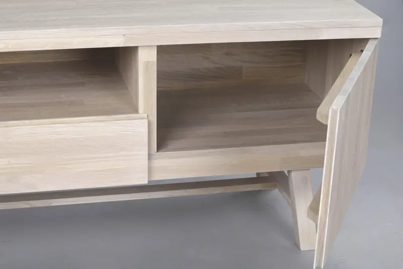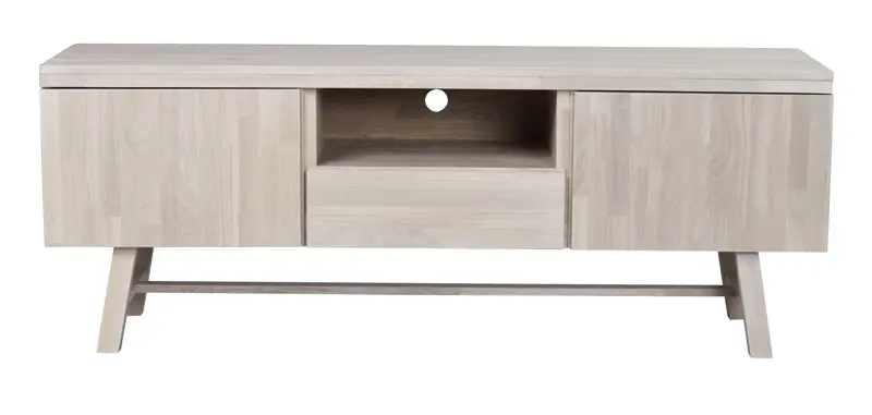Stilren mediabänk i massiv fingerskarvad 100% FSC-certifierad europeisk ek som behandlats med vitpigmenterad olja. Den har ett praktiskt hål för sladdgenomförning på baksidan och soft-close funktion på låda och luckor.