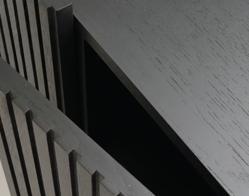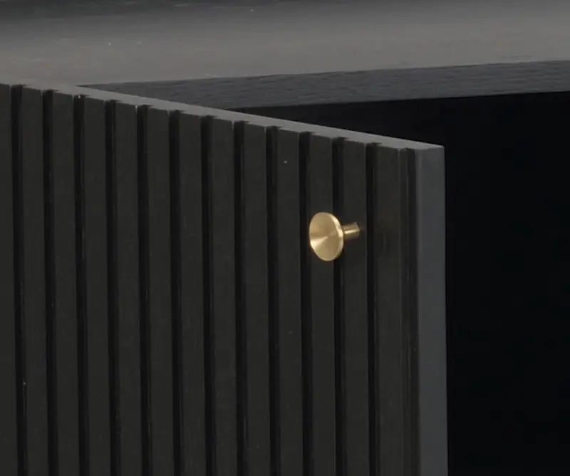Trendiga Halifax sideboard i svartlackad ek med svarta metallben i rak elegant profil. Ytan består av massiva ekribbor på faner. Knoppar i guldfärgad borstad metall medföljer och du väljer själv om du vill sätta dit dem eller ha utan, Dörrarna har mjukstängande soft-close funktion och innanför finns flyttbara hyllplan.