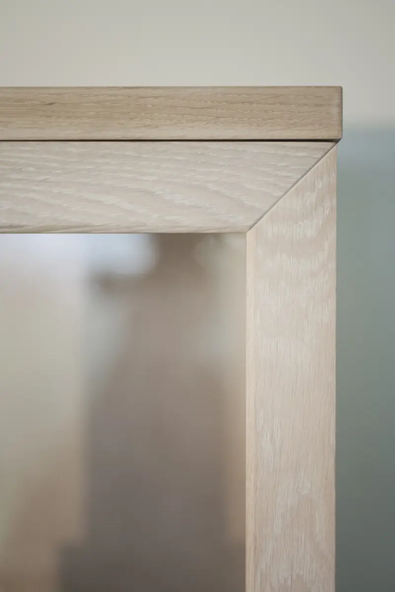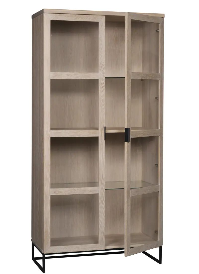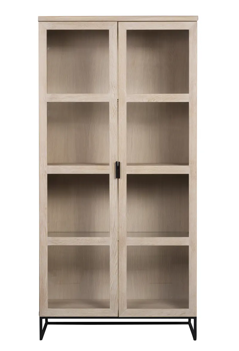 Everett vitrin i vitoljad massiv 100% FSC®-certifierad ek med svart metallunderrede samt handtag. Vitrinskåpet har glasdörrar och en modern borstad yta där kvistar kan förekomma och är med och bidrar till möbelns äkta träkänsla. Innanför dörrarna sitter tre hyllplan, varav två är flyttbara och dörrarna har mjukstängande soft-close funktion. Finns även i brunpigmenterad och svart.