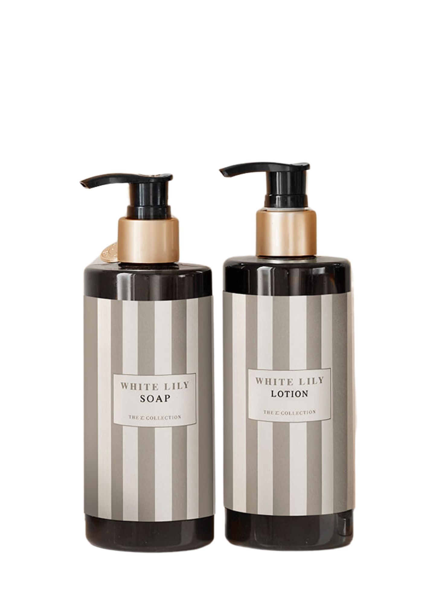 Tvål och lotion med ljuvligt blommig doft av vita liljor. Snygg flaska med detaljer i guld.