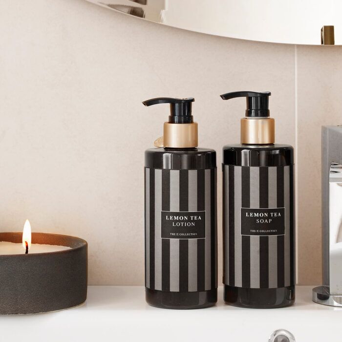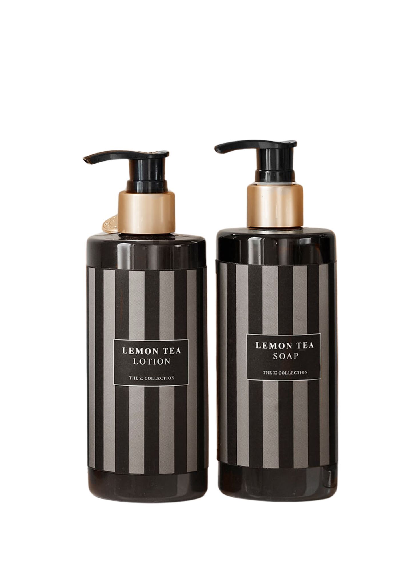 Tvål och lotion med frisk, fräsch doft av citron te. Snygg förpackning med detaljer i guld.