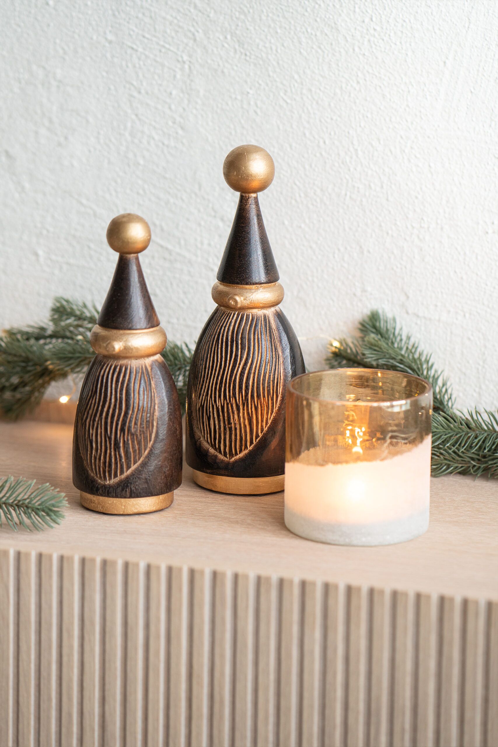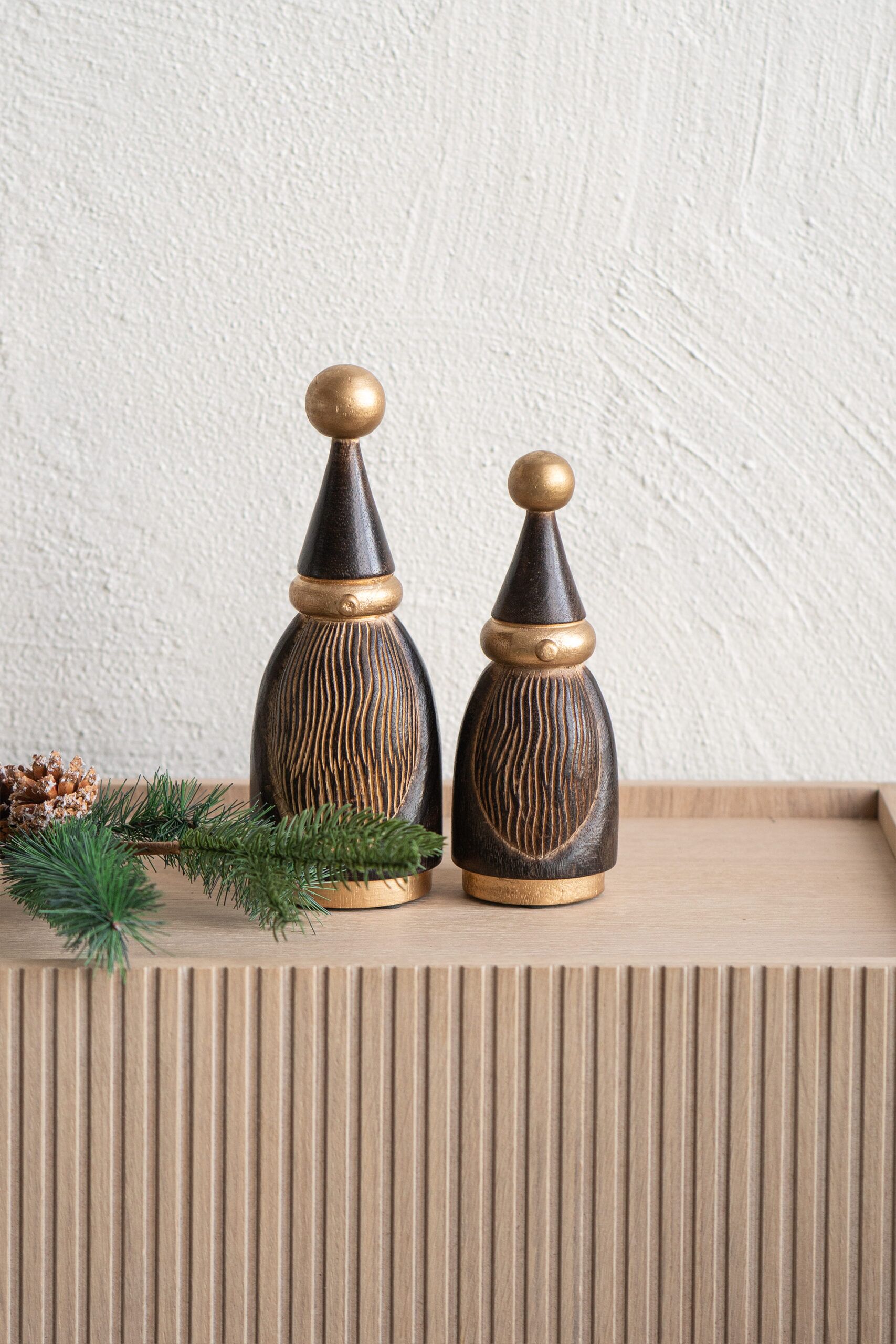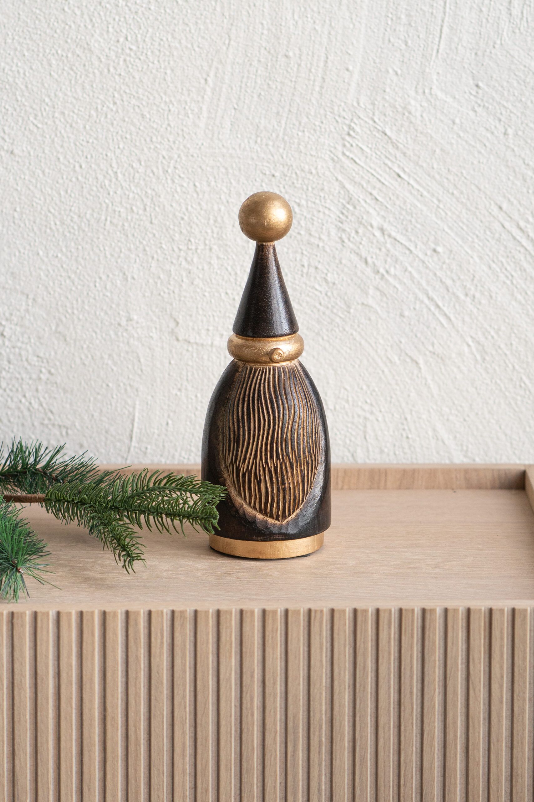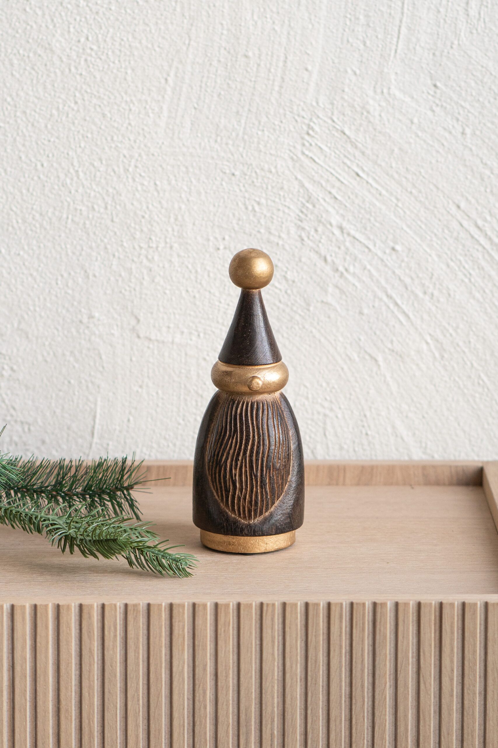 Kul lekfull tomte i trä. Mjuk brun färg med guldiga detaljer. Vår favorit i jul. Finns även i en större modell.