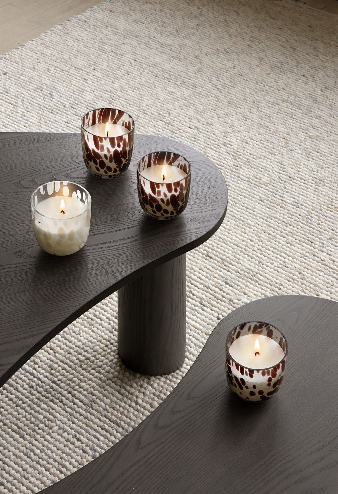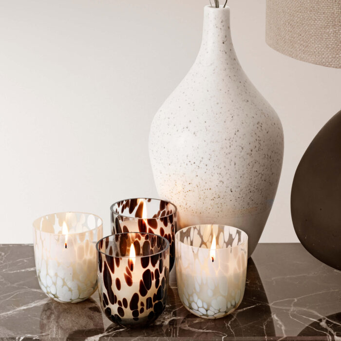 Doftljus Baby Oyster white. Härlig doft av linnen breeze och fresh cotton. Glasbehållare med vitt mönster. Skapar ett vackert sken när det brinner. När ljuset brunnit ut blir det en fin ljuslykta. Finns även med brunt mönster. Brinntid 20h.