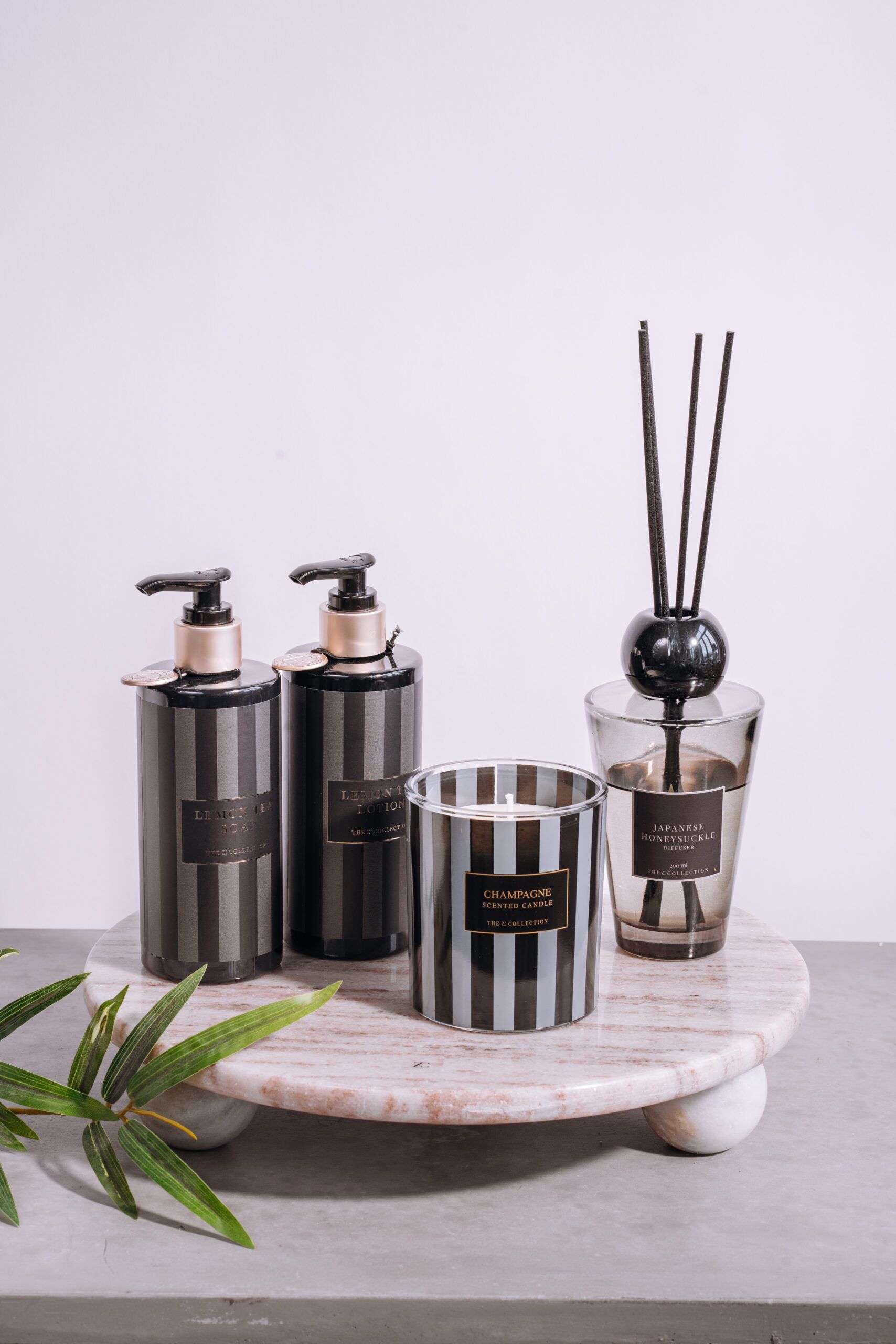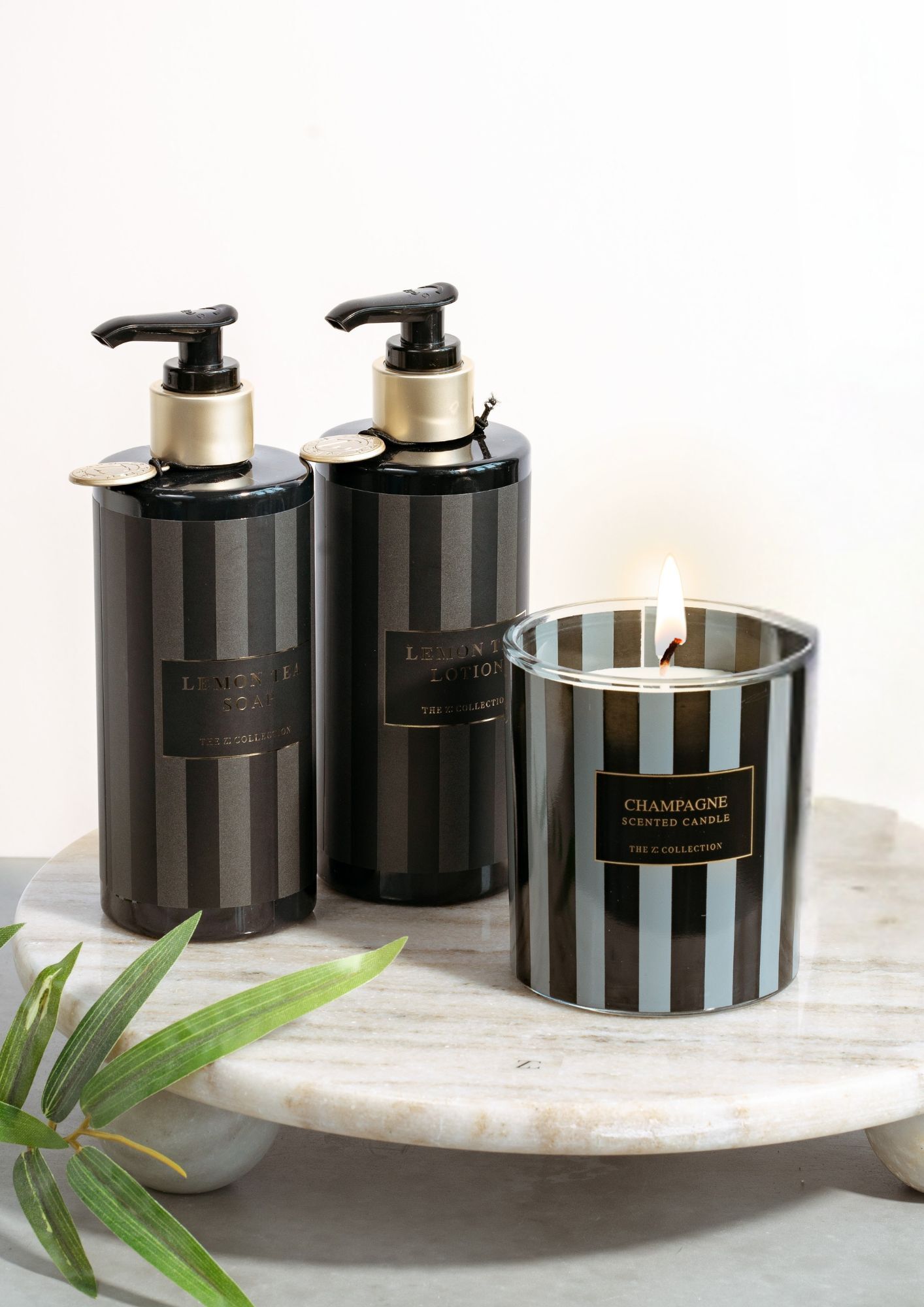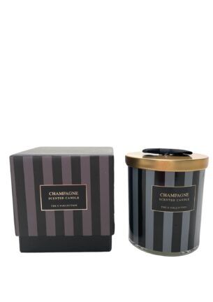 Doftljus Champagne är ett ljuvligt doftljus i en fin metallbehållare med en söt svart rosett på locket. Fräsch bubblig champagne med inslag av vanilj och pion Levereras i en fin presentförpackning. Brinntid ca 30h Färg svart/grå/guld Material stearin / metall