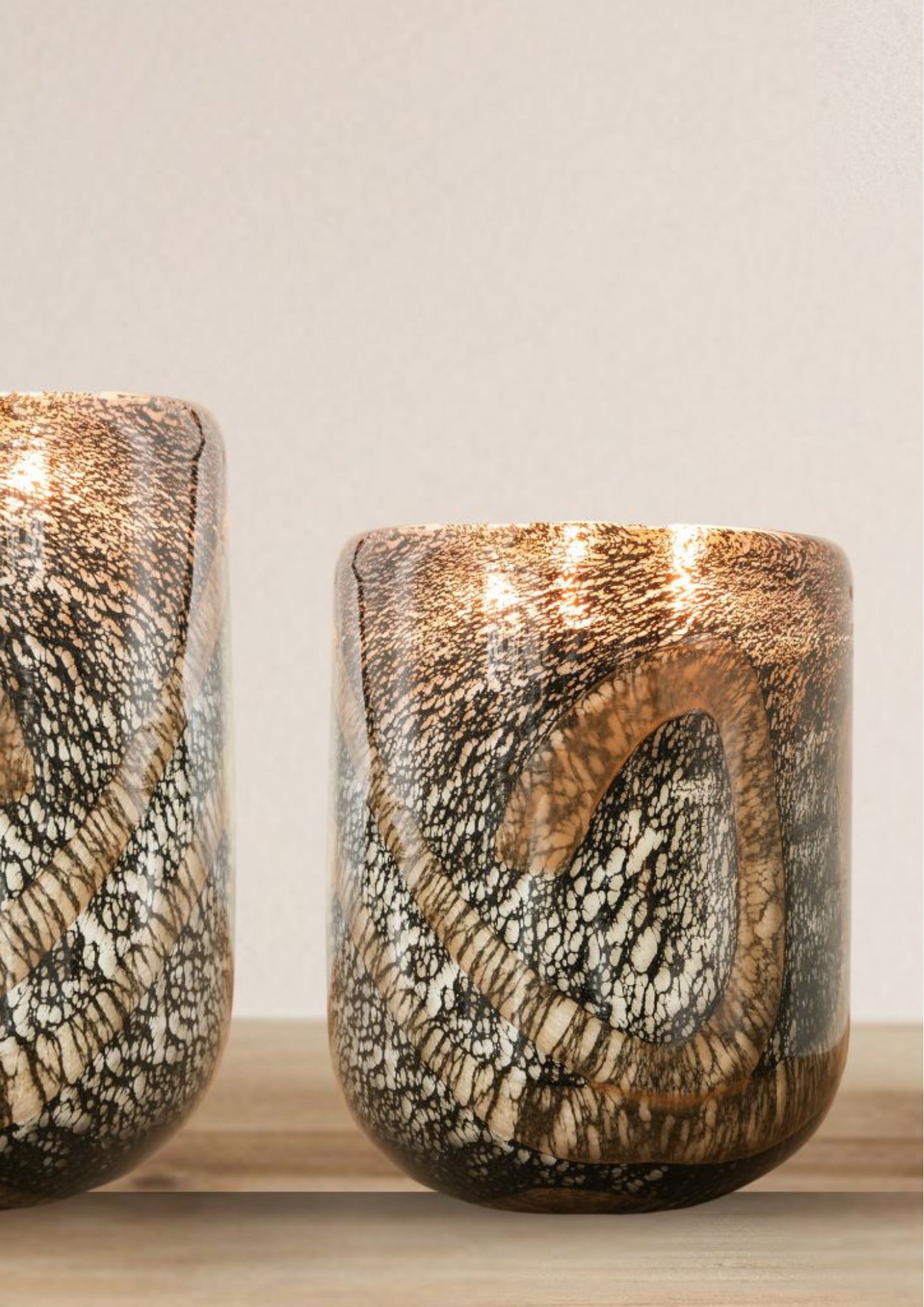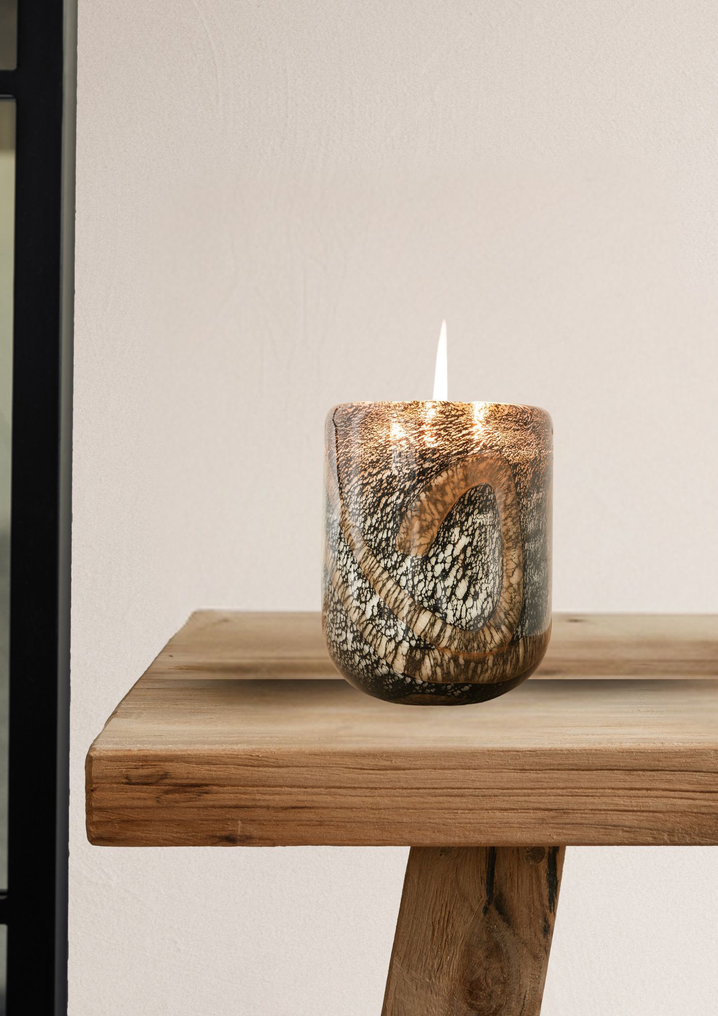 Glaslykta i tungt konstglas med exklusivt doftljus. Doft av amber med blommiga noter tillsammans med patchouli med en svagt kryddig och örtig ton. Kan återanvändas som vacker lykta. 800g. Brinntid ca 80 timmar.