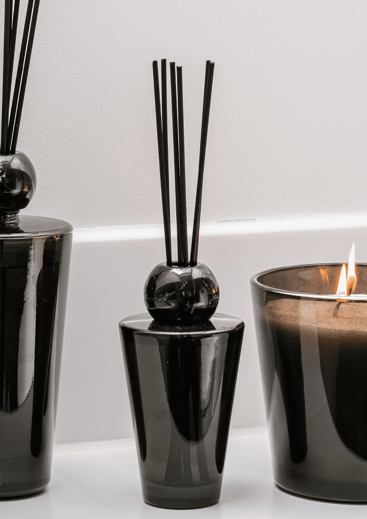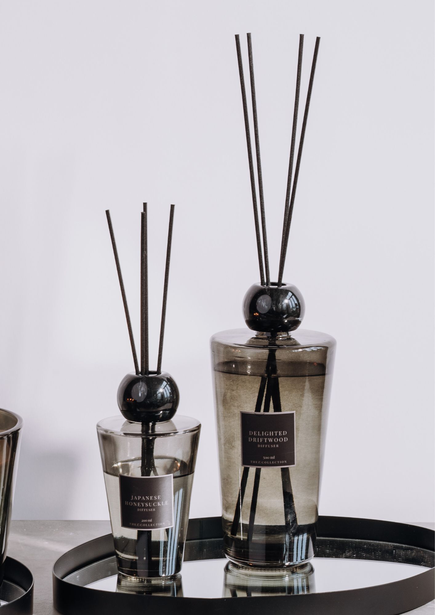 Doftstickor i svart glasflaska med etikett och dekorativ kula i poly. Långa svarta stickor ingår. Doft Japanese Honeysuckle, Japansk viol ger en exotisk och frisk doft av tropiska sommarblommor som skapar en lung och behaglig stämning i rummet