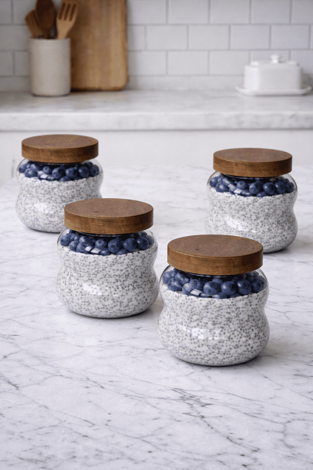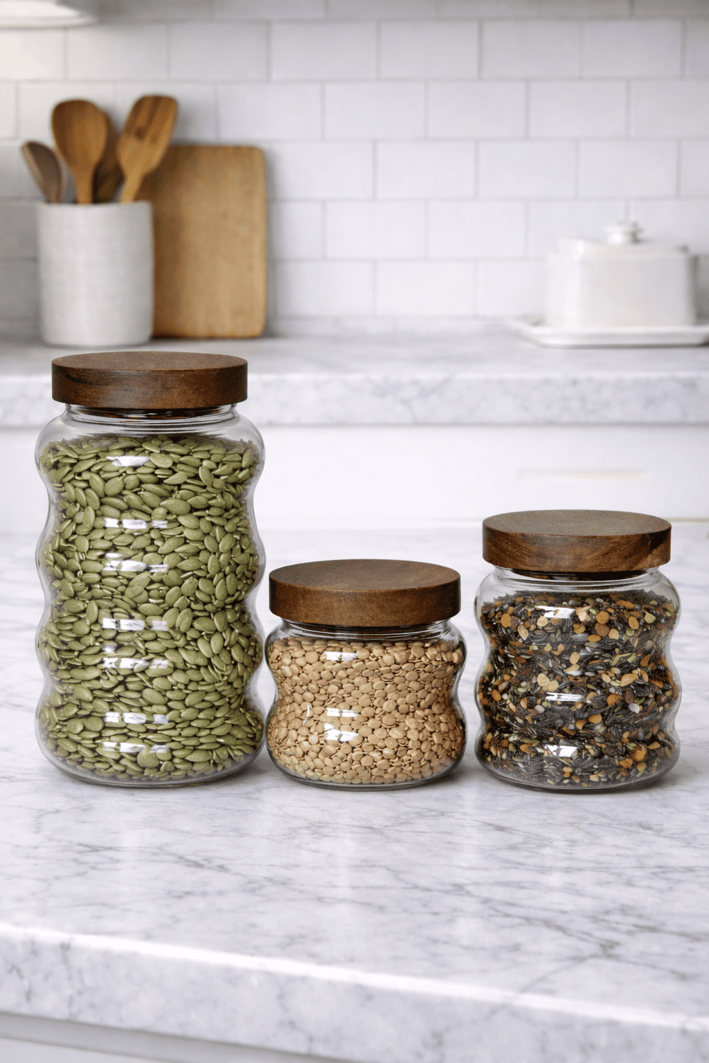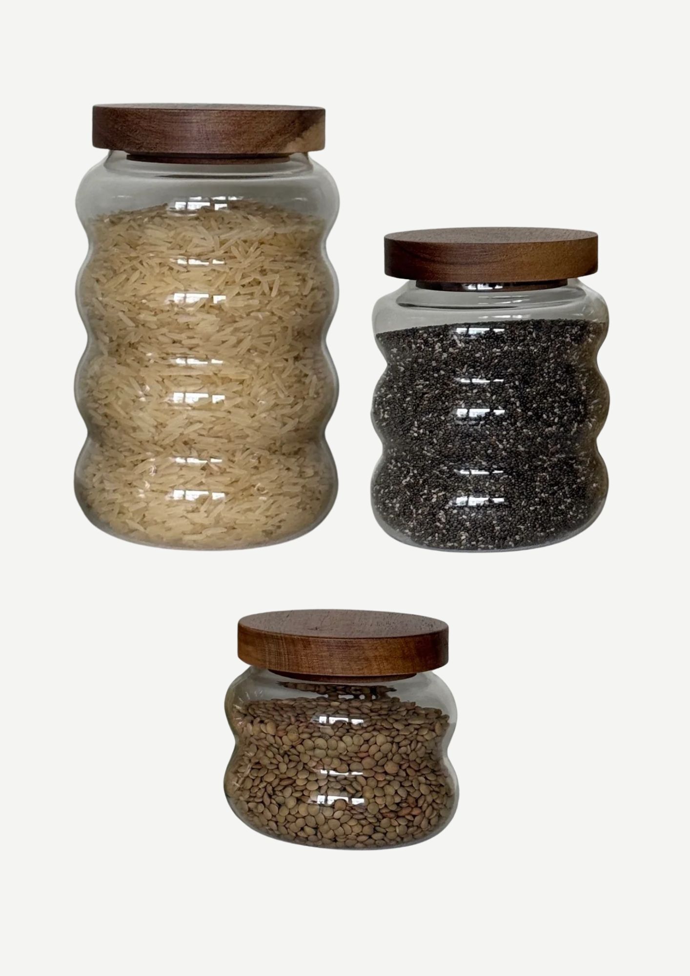 Vackra glasburkar med trälock kombinerar funktionalitet med snygg design. Burkarna är tillverkade av klart, hållbart glas. Oavsett om det är torkade örter, kaffebönor eller småsaker. Det naturliga trälocket är tillverkat av akacia och är förseglat med en silikonring för att hålla innehållet fräscht. Finns i tre storlekar Storlek: 9x9cm Material: Glas, akacia
