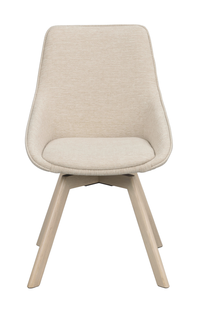 Populära Alison stol med träunderrede och snurrfunktion. Här syns den i ett tåligt ljusbeige tyg och med ben i vitpigmenterad ek. Alison har en stoppad sits med hög sittkomfort i kupad design och ben med snurrfunktion i 360 grader. Stolen passar perfekt runt matbordet men även som udda stol till skrivbordet. Alison är FSC®-certifierad och finns även i andra jordnära färger. Säljs endast i 2-pack.