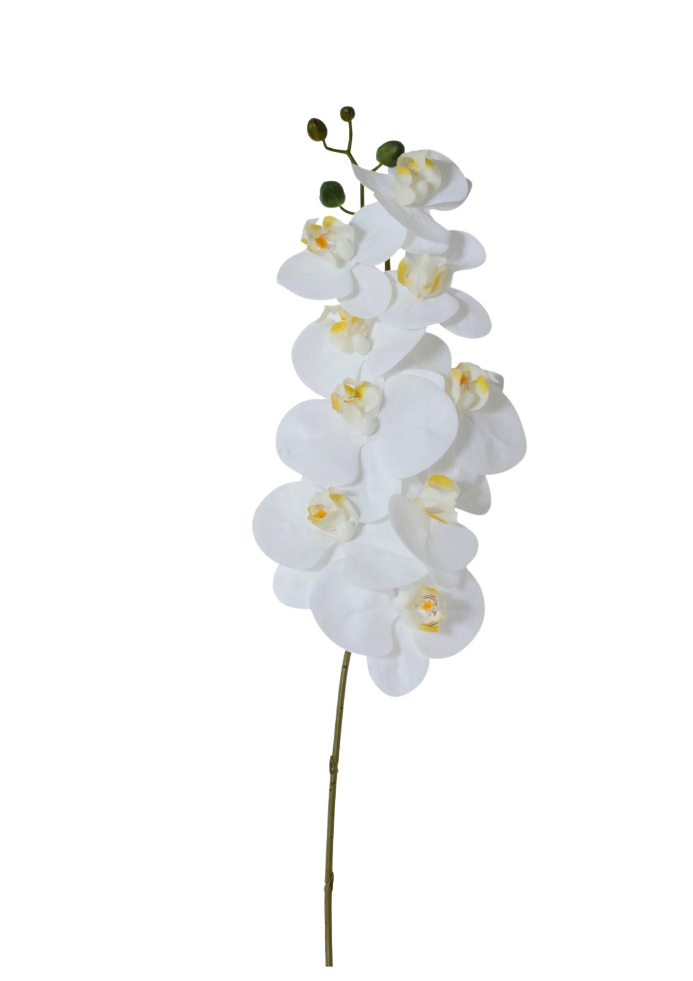 Denna naturtrogna orkidékvist är inspirerad av den klassiska Phalaenopsis, känd för sina mjuka kronblad och stilrena uttryck. Med sina verklighetstrogna detaljer, subtila färgskiftningar och naturtrogen form är den svår att skilja från en äkta blomma – men helt utan krav på skötsel.
