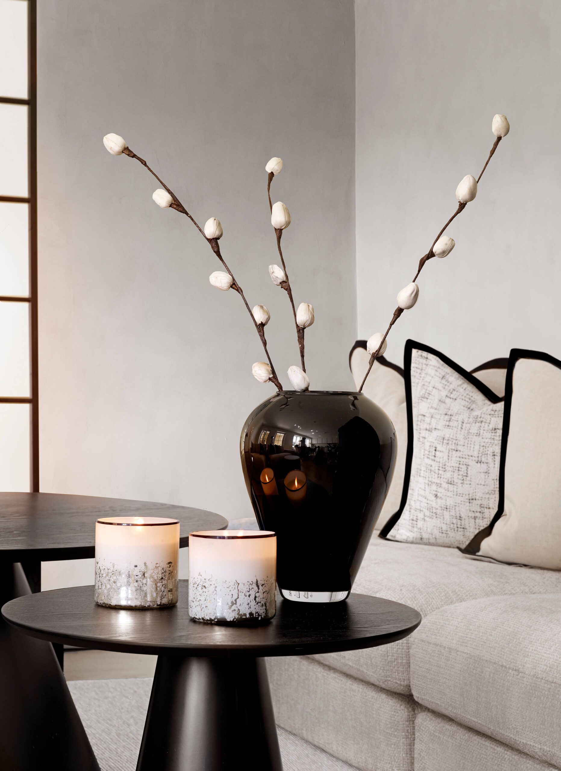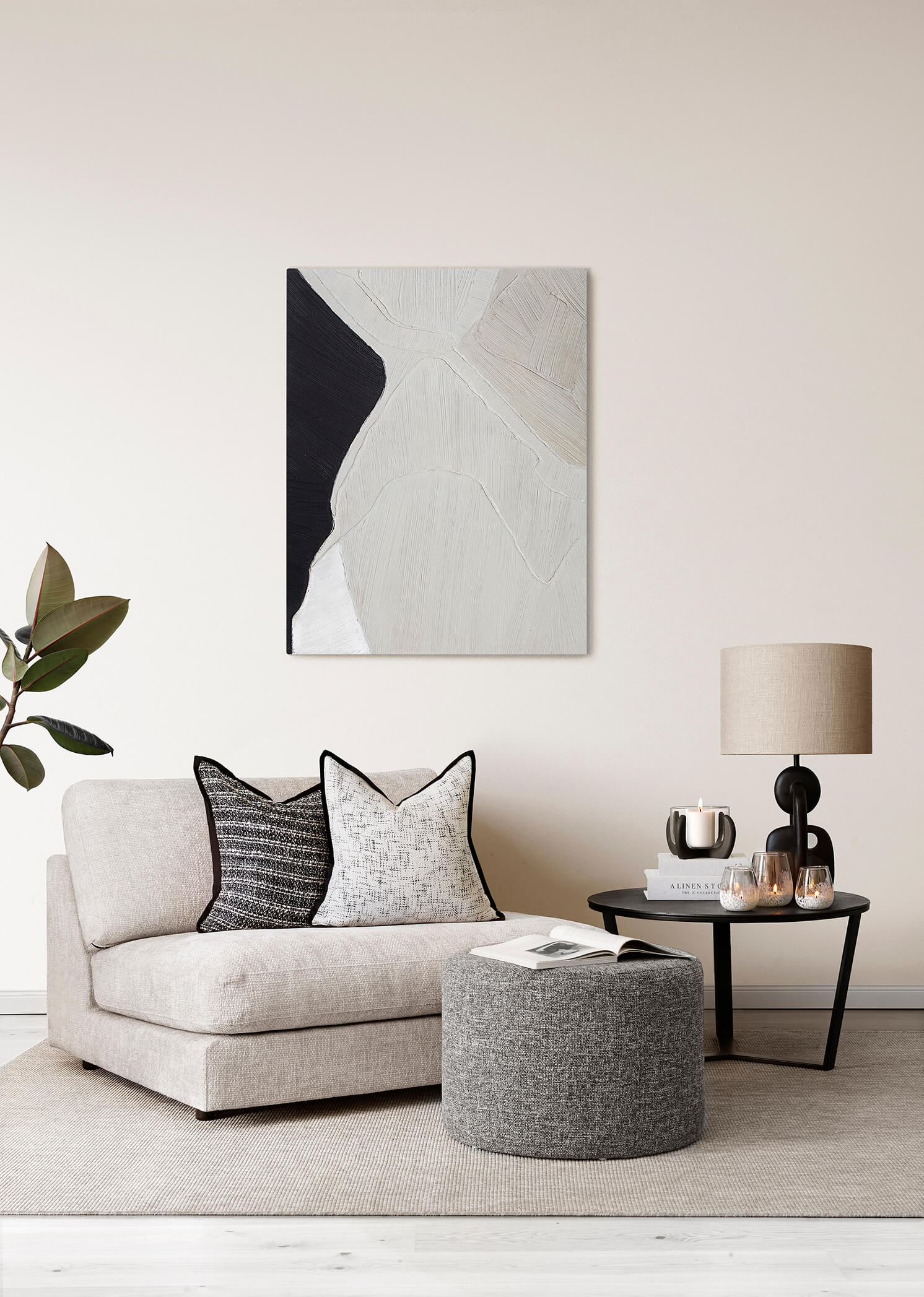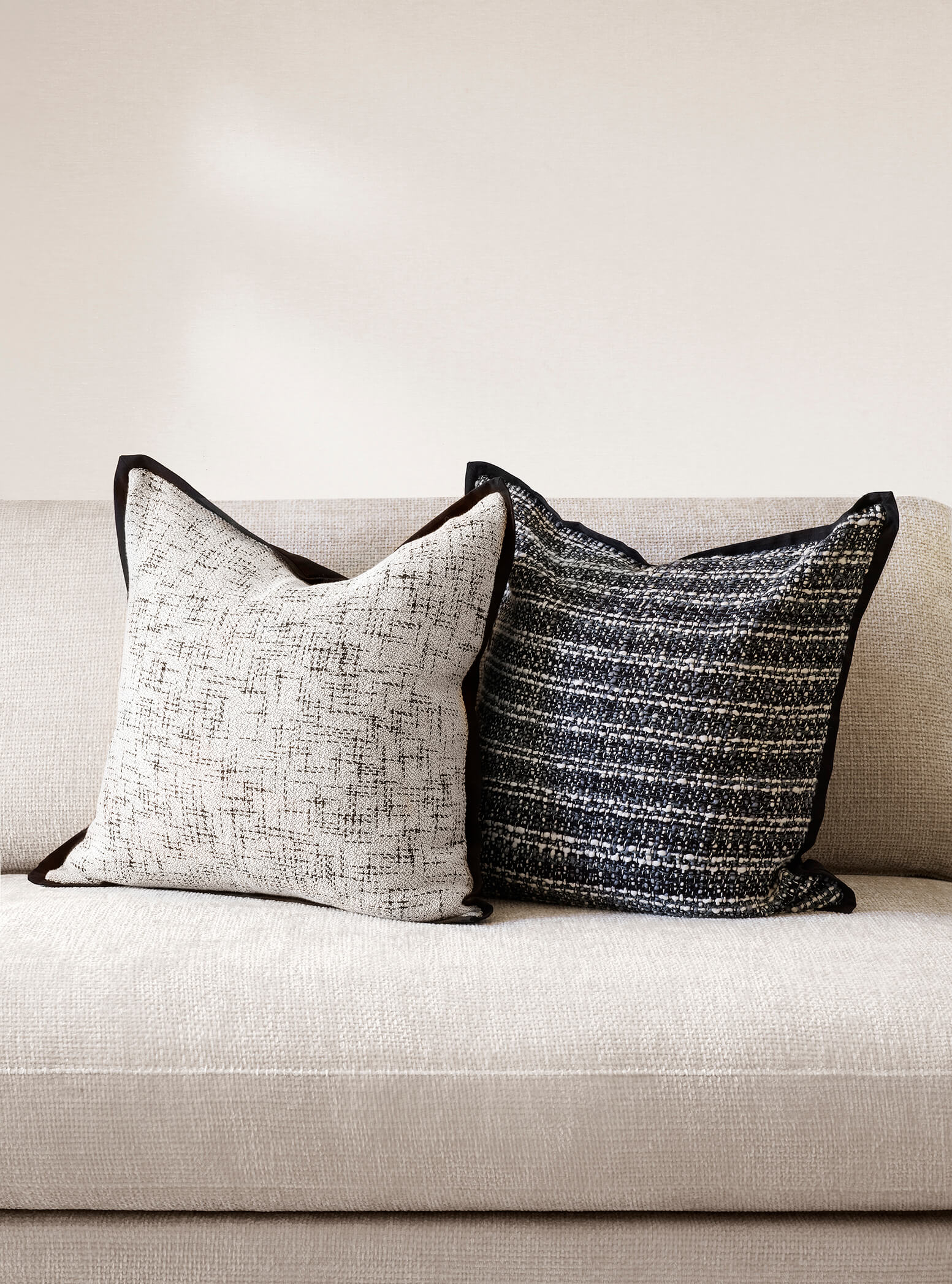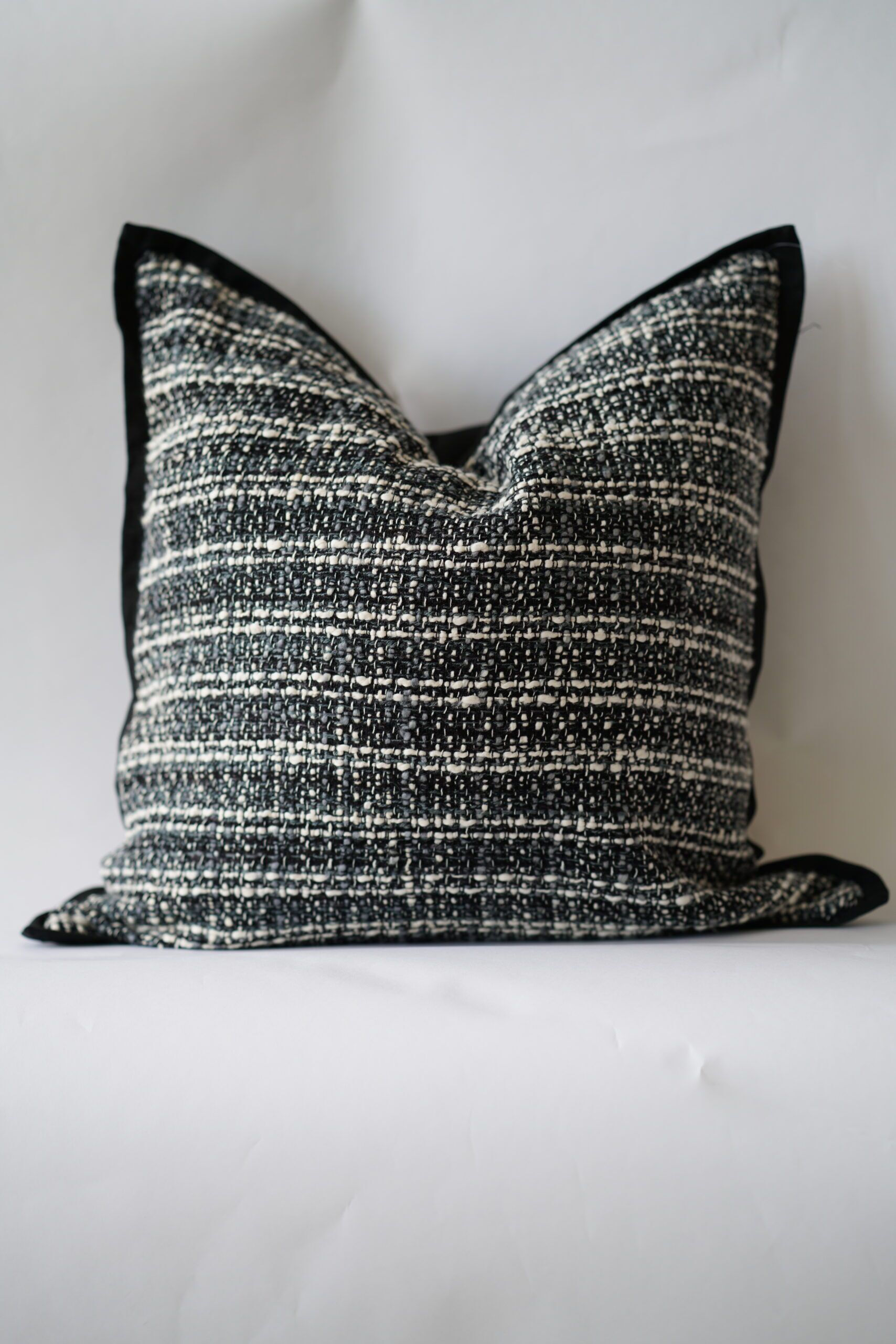 Kuddfodral i lite grövre linne. Grå, vit och svart melerad med svart kant. Matcha fint med kuddfodral Chantal.