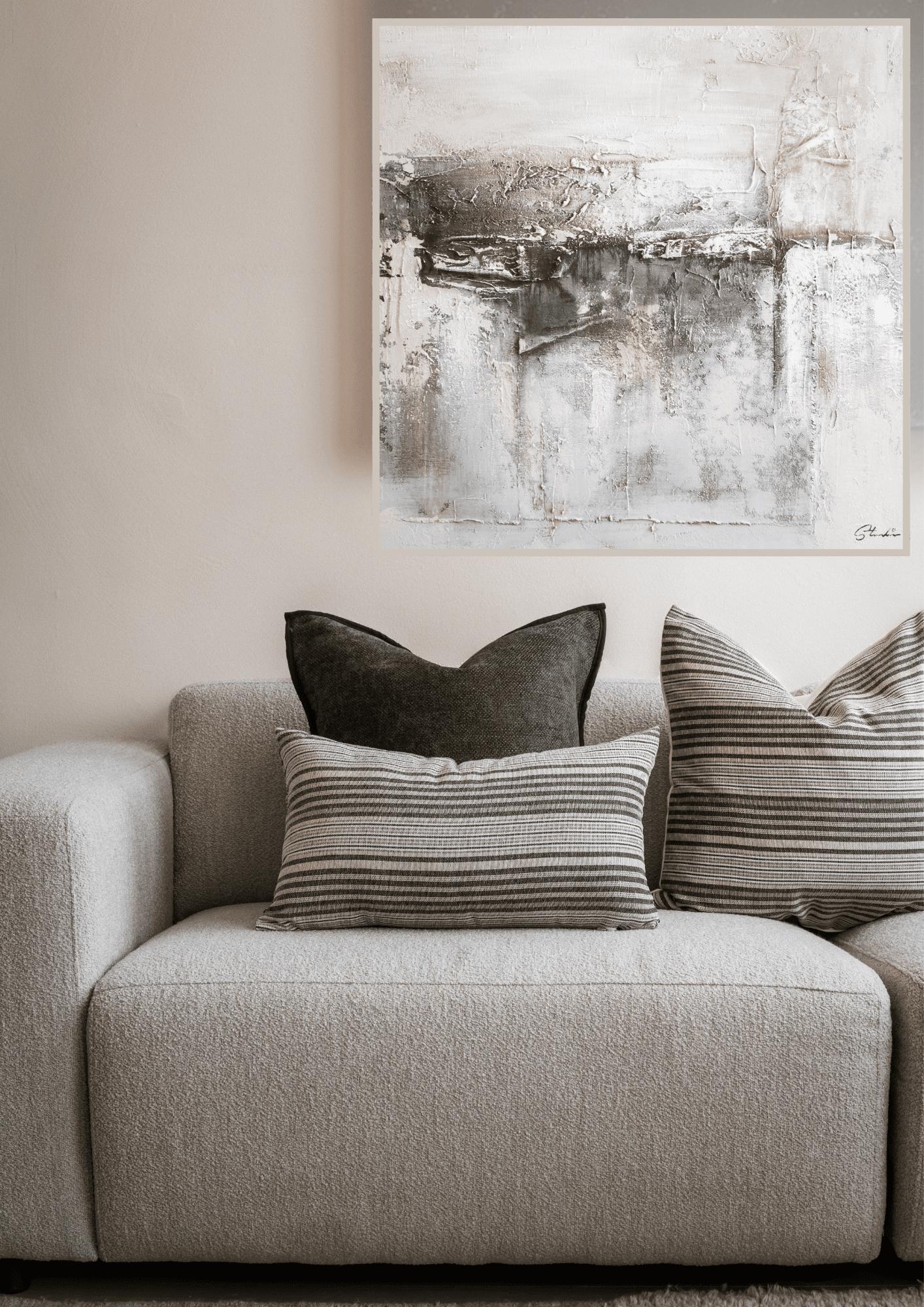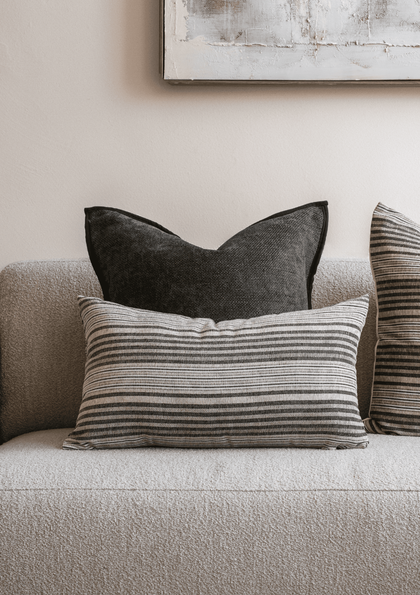 Snygg enkel kudde i lite grövre linneliknande tyg. Randig kudde med samma tyg på båda sidor. Finns i en storlek till.