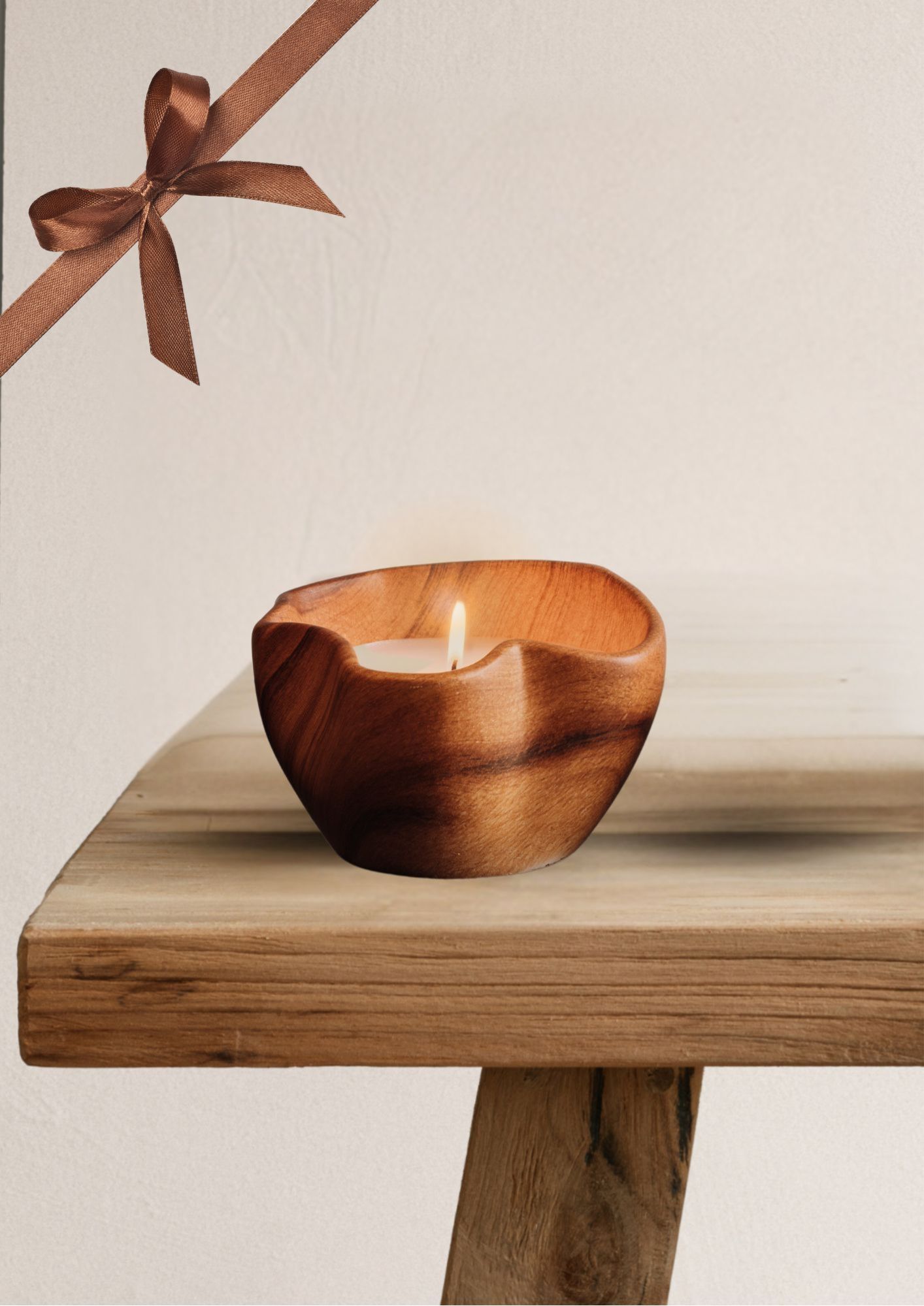 Ljus i keramik fylld med stearin. Rustik känsla med naturtroget mönster som ser ut som trä. Dekorativt och en riktigt fin inredningsdetalj.