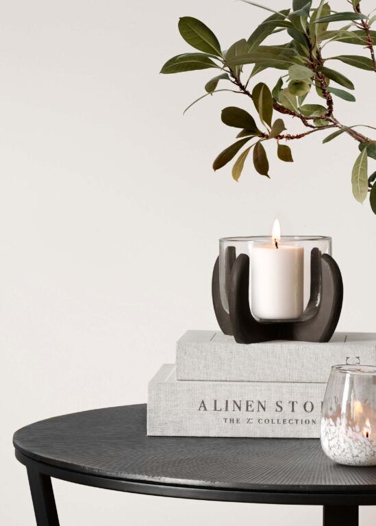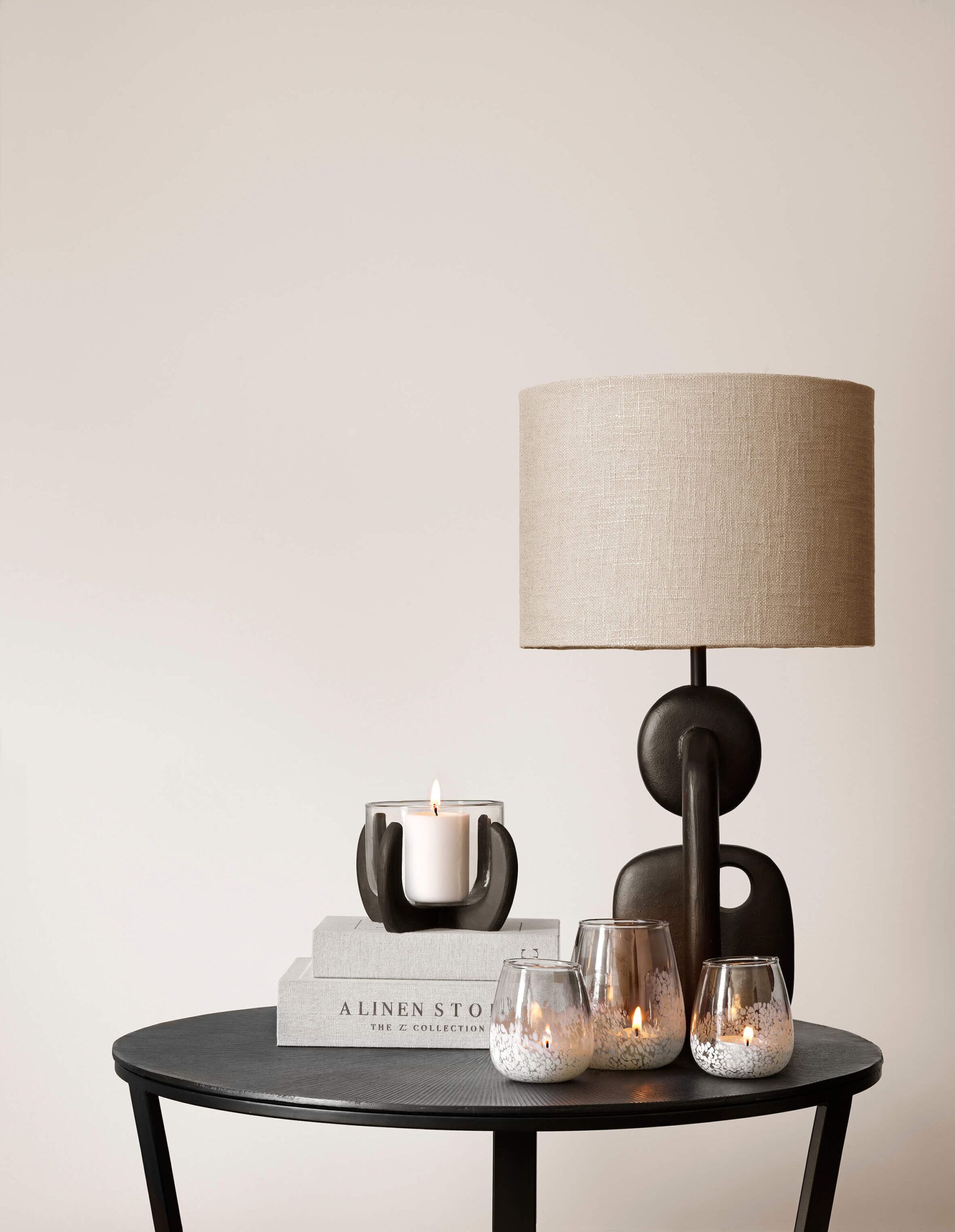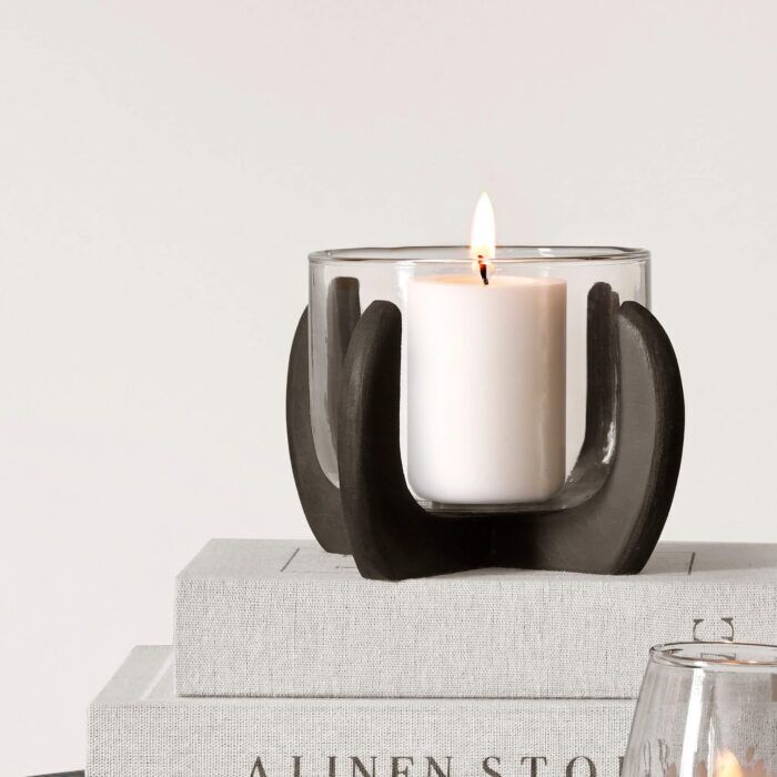 Ljuslykta/skål i läcker design. Hållaren är handgjord i svartmålat trä. Ljuslyktan/skålen är i klart munblåst glas. En fin artikel som är varsamt framtagen.