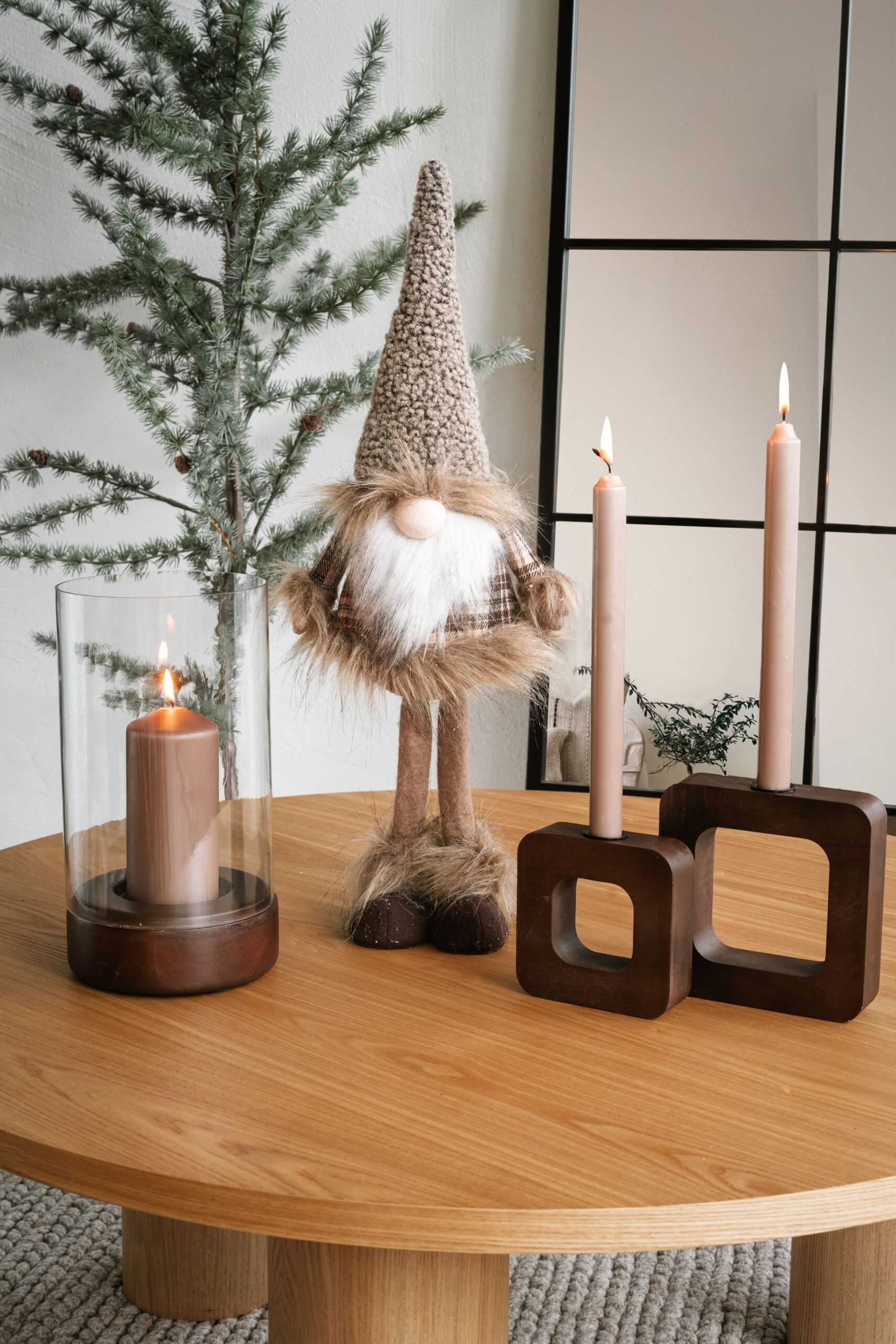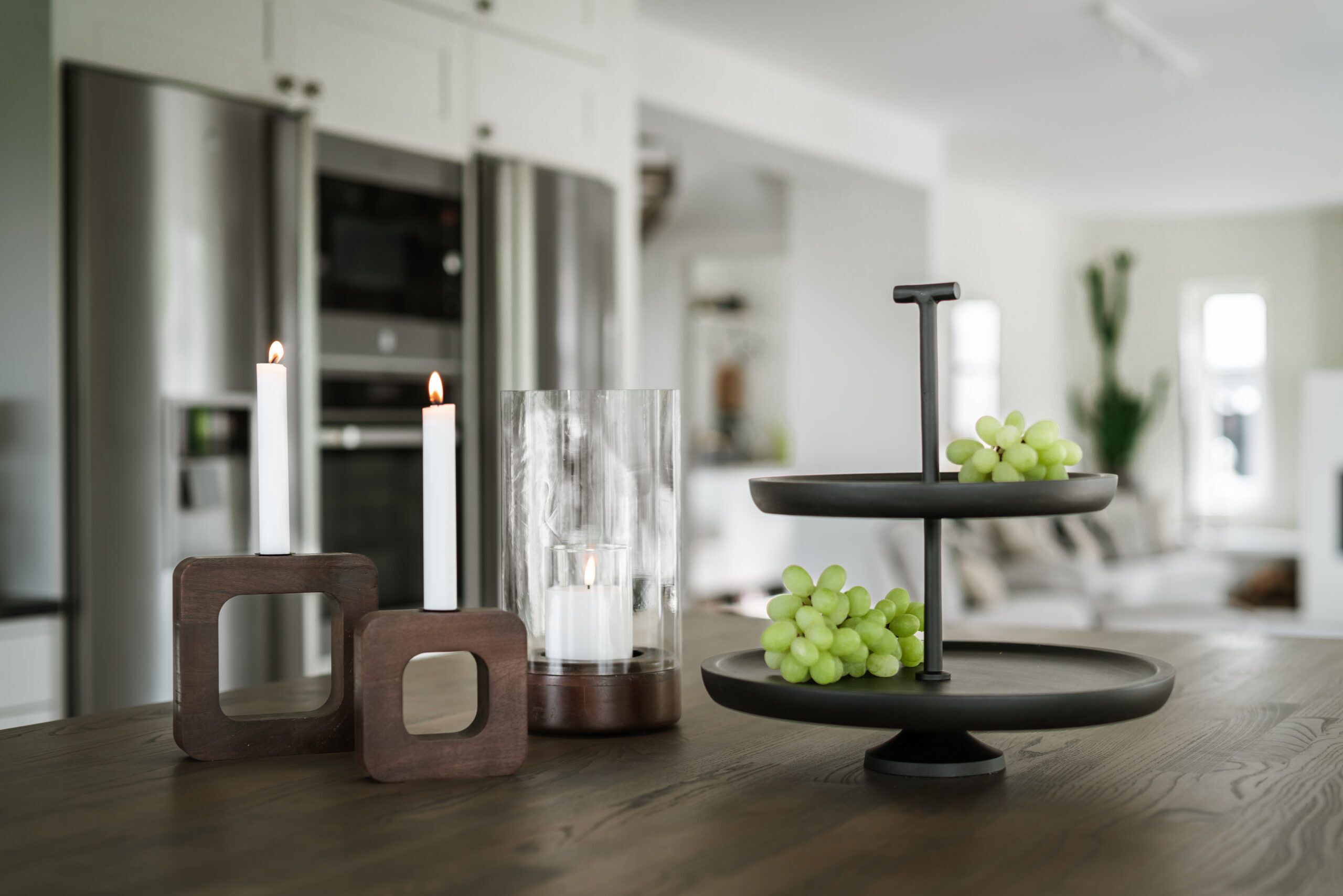 Ljusstakar i modern design, snygga och lättplacerade i mörkt trä. Passar till kronljus.