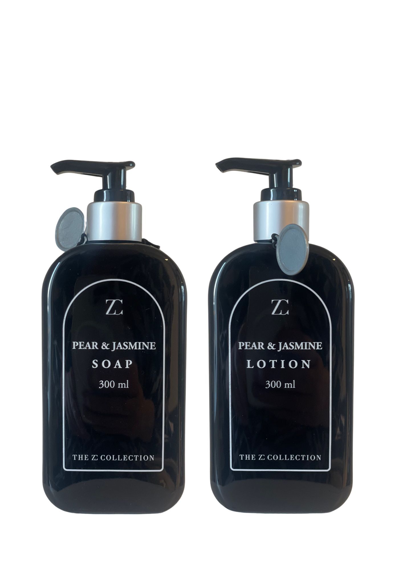 Krämig lotion i behållare av återvunnet plast. Fin amulett runt halsen. Ljuvlig doft av sommarpäron och jasmine.