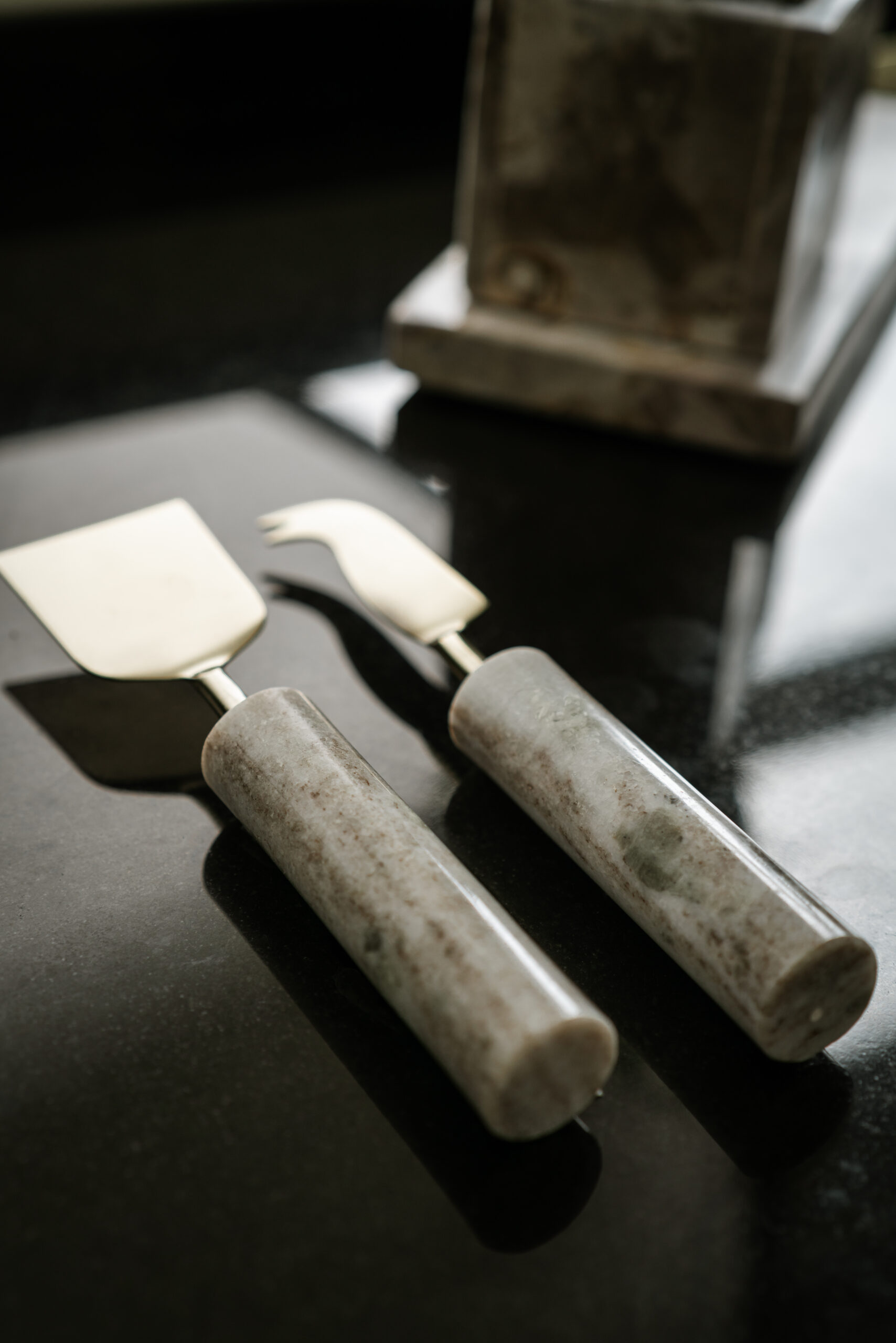 Lyxiga ostknivar i guld och marmor. Fina tillsammans med Middleton Marmorbricka. Eleganta och stilfulla att sätta fram till ostbrickan. För att metallen och marmorn ska behålla sin fina lyster rekommenderar vi att de diskas förhand.