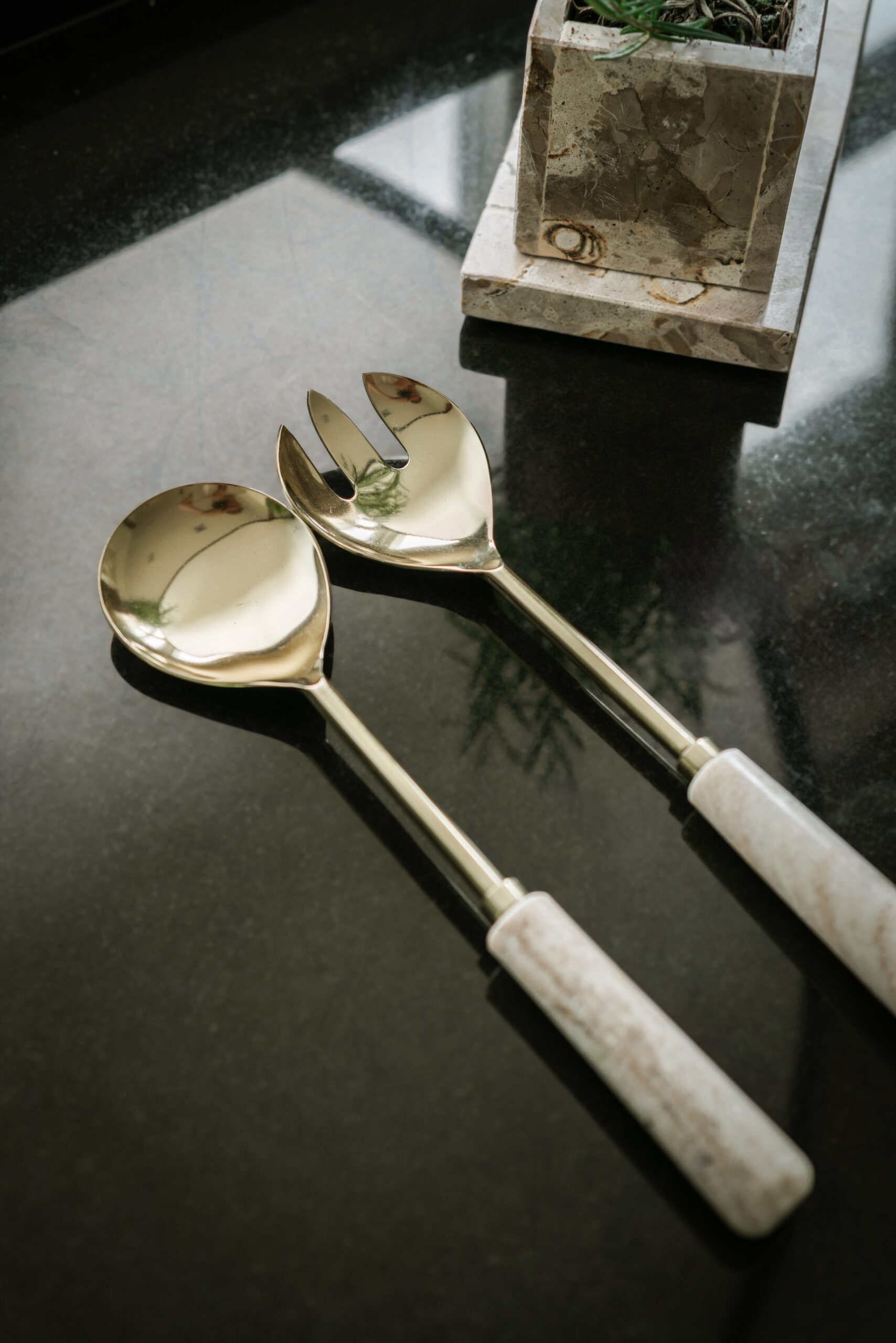 Lyxiga salladsbestick i guld och ljus marmor. Eleganta som uppläggningsbestick eller till en fin salladsskål. För att metallen och marmorn ska behålla sin fina lyster rekommenderar vi att de diskas förhand.