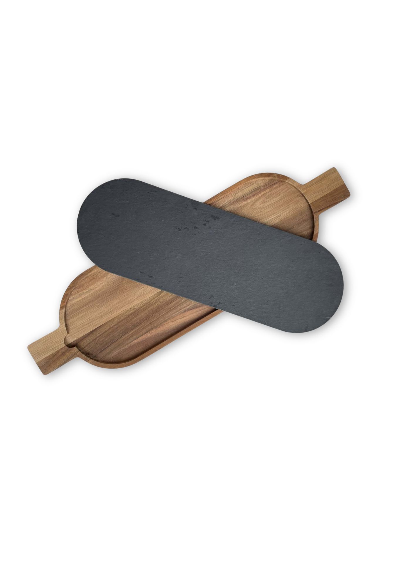Serveringsfat i mjukt mangoträ tillsammans med ett avtagbart skifferfat som tål lite "blötare" mat senare. Fint att duka med på en tapaskväll eller som serveringsfat på buffén. Storlek Fat: 38x13 cm Bricka 50x15 cm