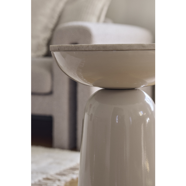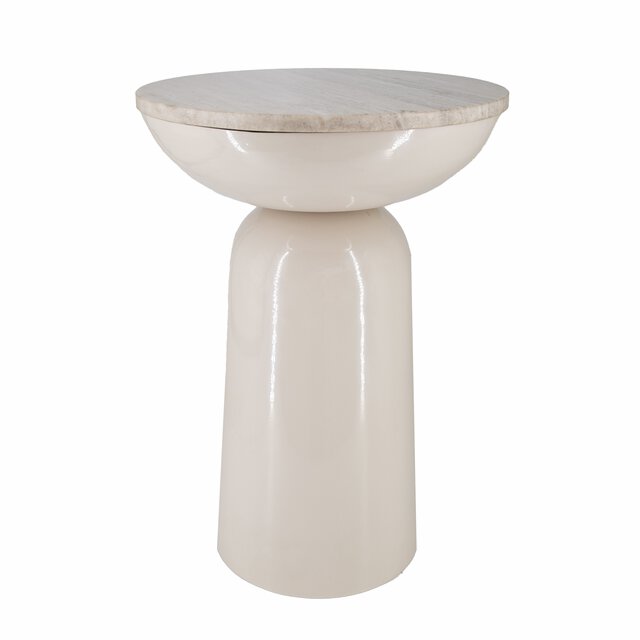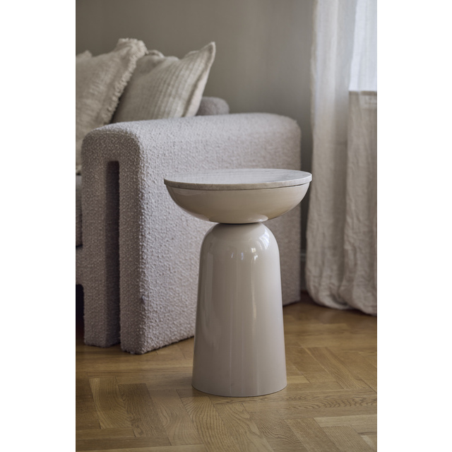 Runt och vackert sidobord i metall med beige marmorskiva med beige metallfot. Sidobordet är perfekt i vardagsrummet för ditt kaffe eller en god bok. Marmor är en natursten, så mönstret på bordsskivan kommer att variera från produkt till produkt.