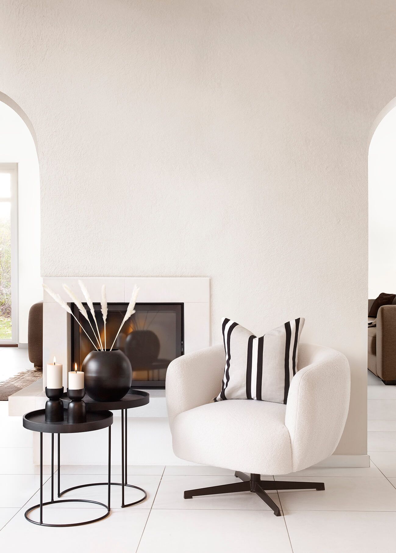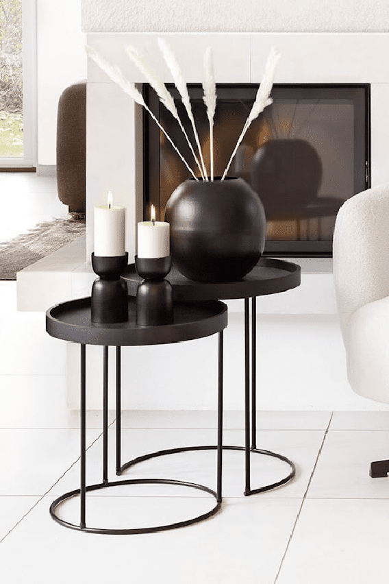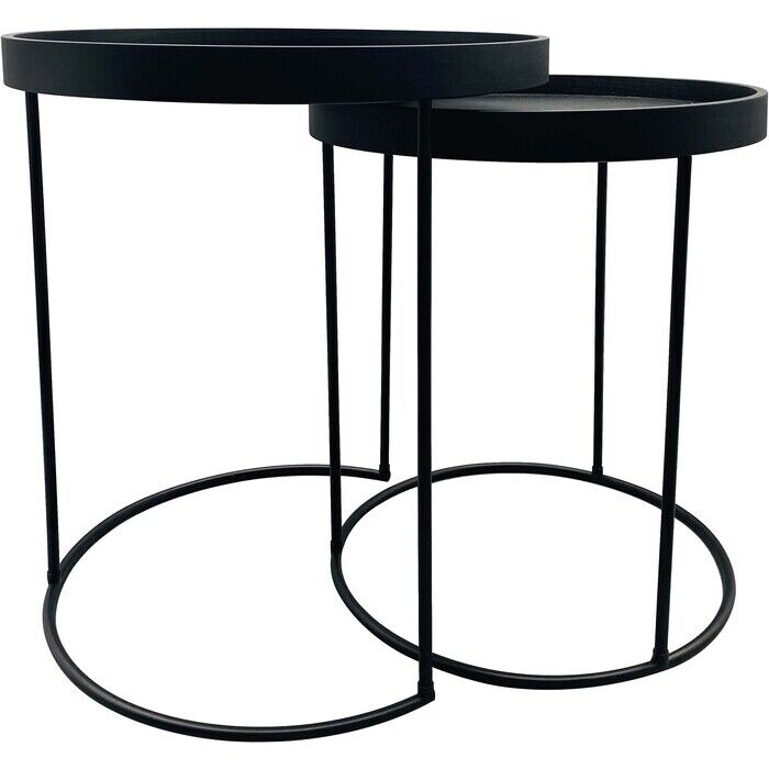 Svart sidobord i ett set om två bord. Underredet är i metall med rund avtagbar bordstopp som även användas som brickor.