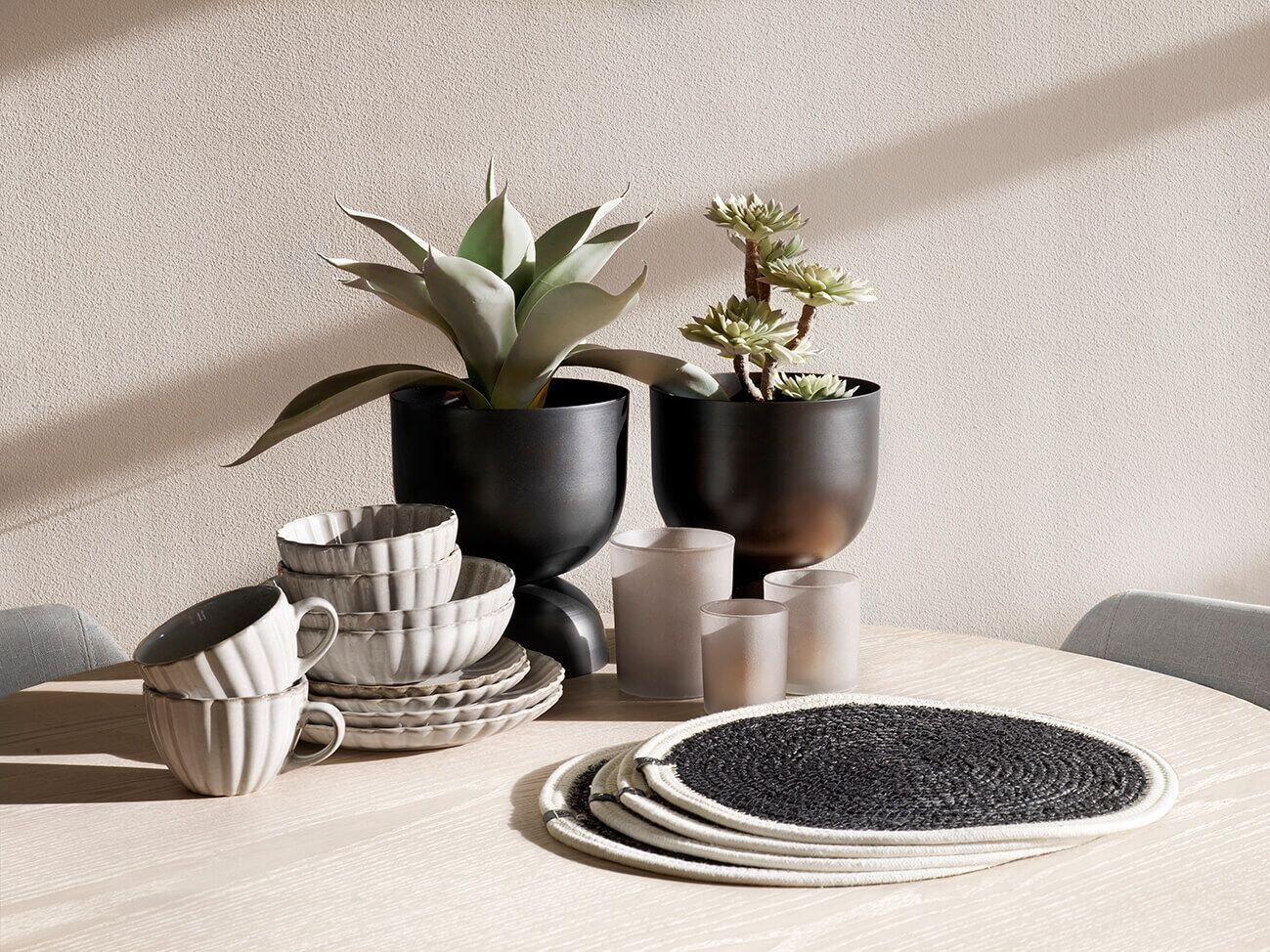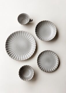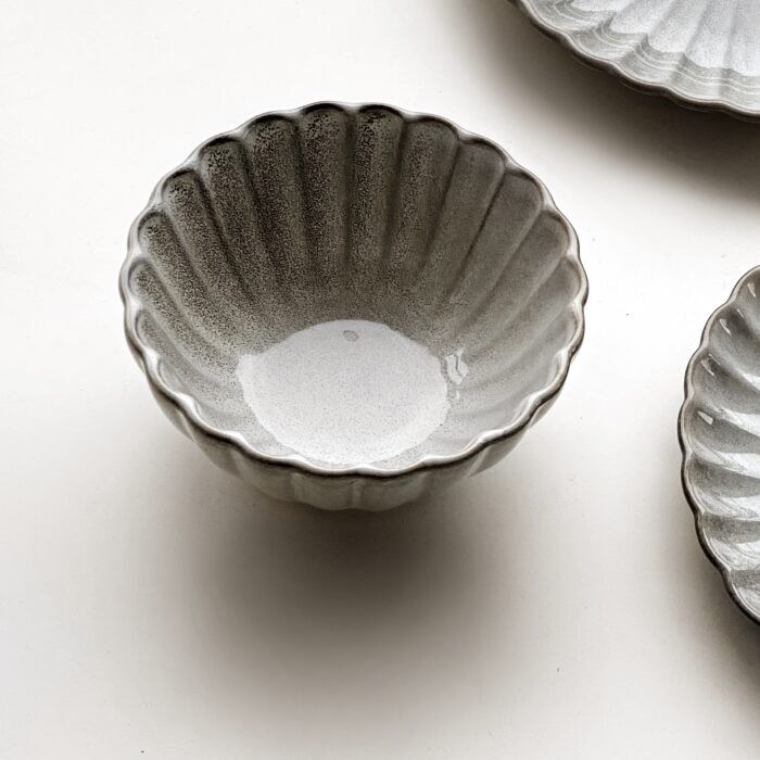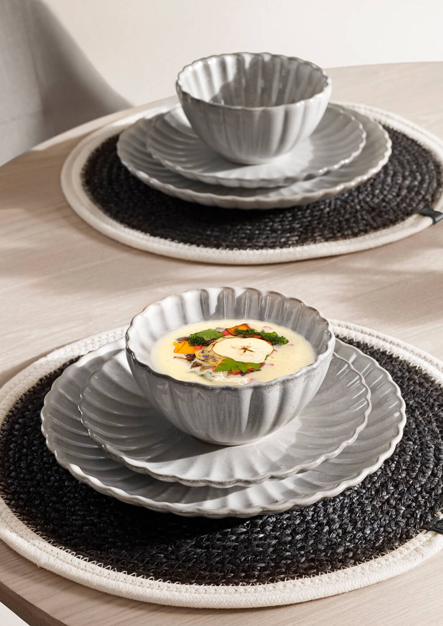 Grå/beige skål med blank finish. Mjuk böljande kant gör dukningen extra festlig, här gör du snygga upplägg i ditt egna mästerkockskök! Dahlia är en hel servis med mattallrik, assiett, pastatallrik, skål och kaffekopp