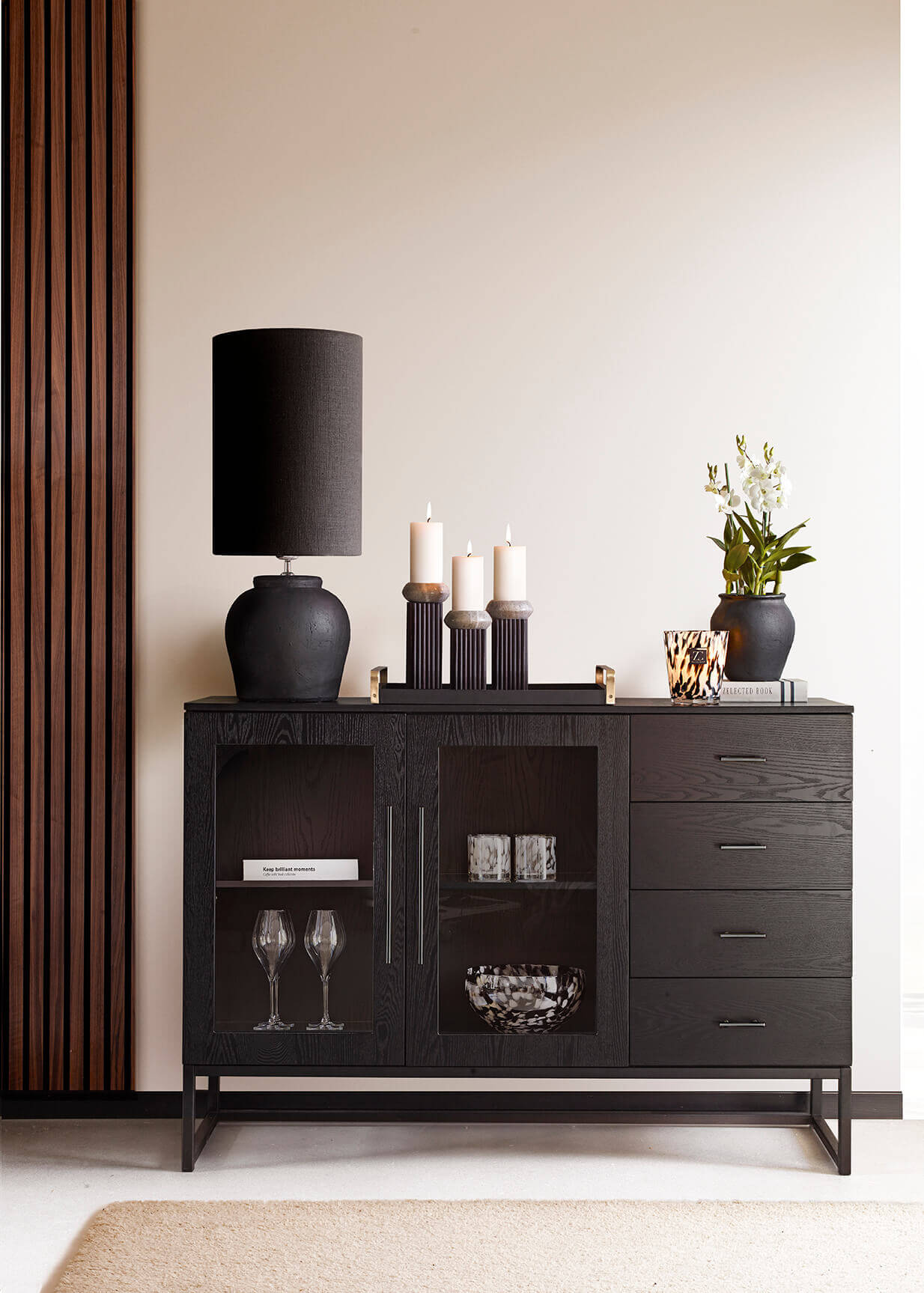Gedigen och robust skänk i svart trä med lådor och glasdörrar. Handtag i matt svart med svarta metallben. Skänken rymmer mycket och har plats för både lampor, vaser, tavlor, blommor och ljusstakar ovanpå.