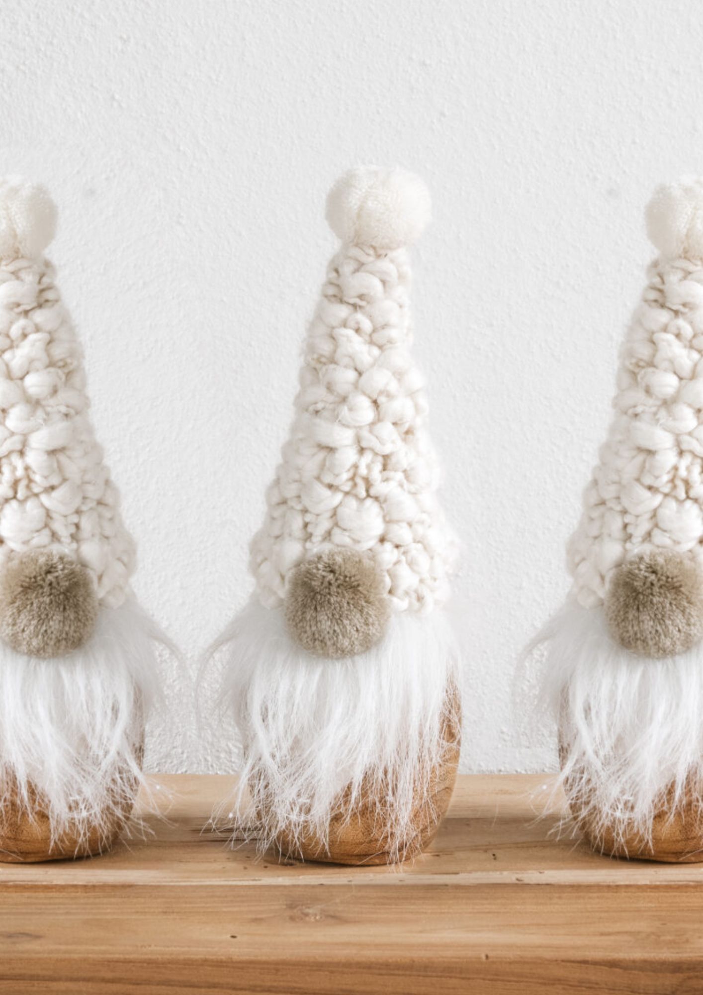 Gullig tomte med lurvig luva i naturliga färger. Stadig fot i trä.