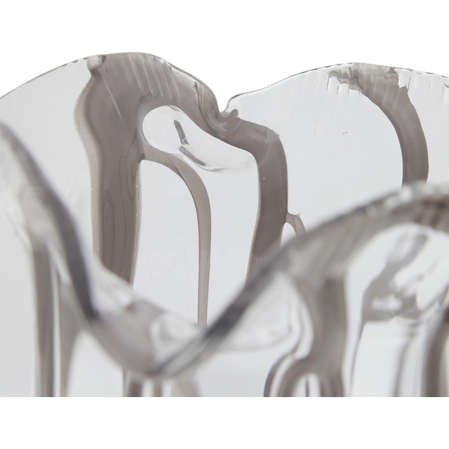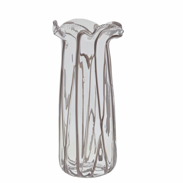 Tillför elegans och lätthet till din inredning med denna dekorativa Alberta-glasvas från Lene Bjerre. Vasen har en hög, slank silhuett och en vacker vågig kant som skapar ett organiskt och feminint uttryck. Det klara glaset med subtila linjära texturer fångar ljuset och framhäver vasens konstnärliga form – perfekt för både färska blommor och torkade grenar.